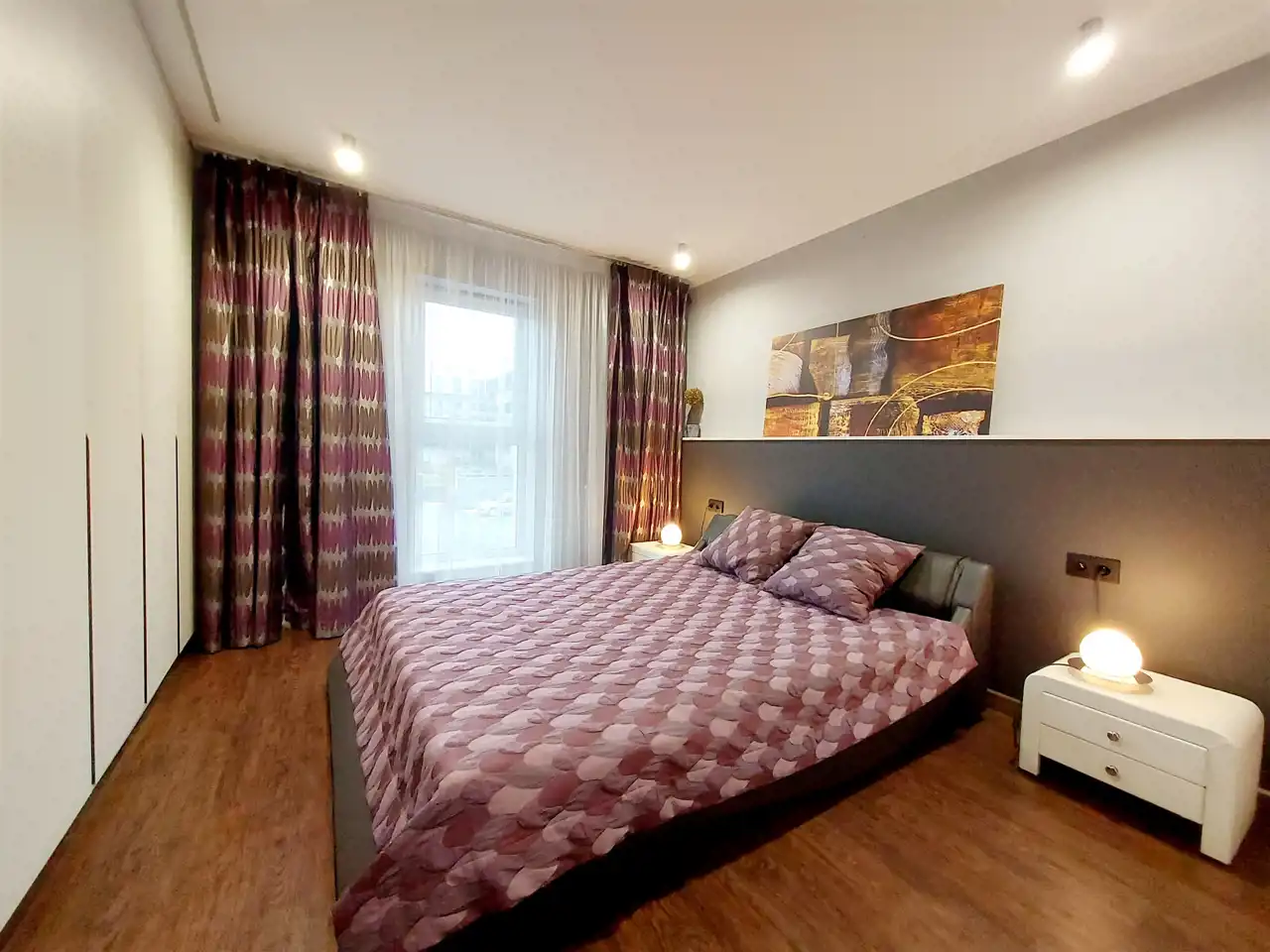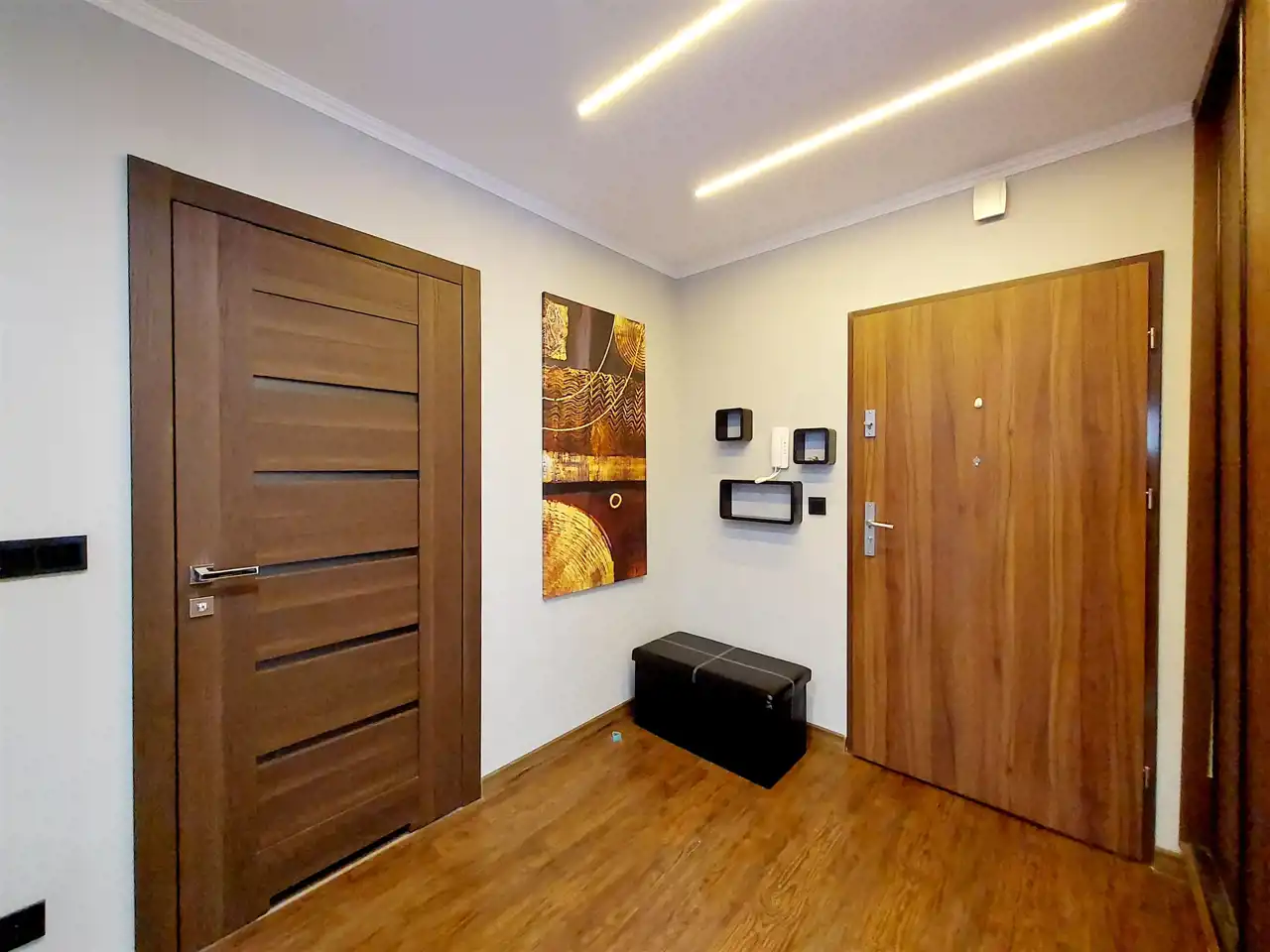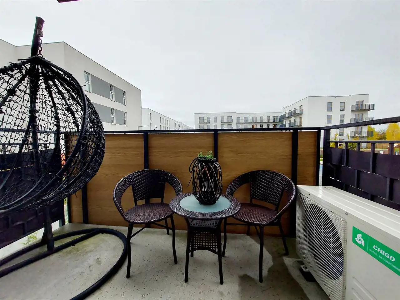 Nieruchomość składa się z salonu z aneksem kuchennym oraz z wyjściem na balkon, sypialni, łazienki oraz przedpokoju. W pokojach zamontowana klimatyzacja. W sypialni i w przedpokoju pojemne szafy w zabudowie. Kuchnia w zabudowie wraz ze sprzętem agd (płyta indukcyjna, piekarnik, okap, lodówko-zamrażarka).