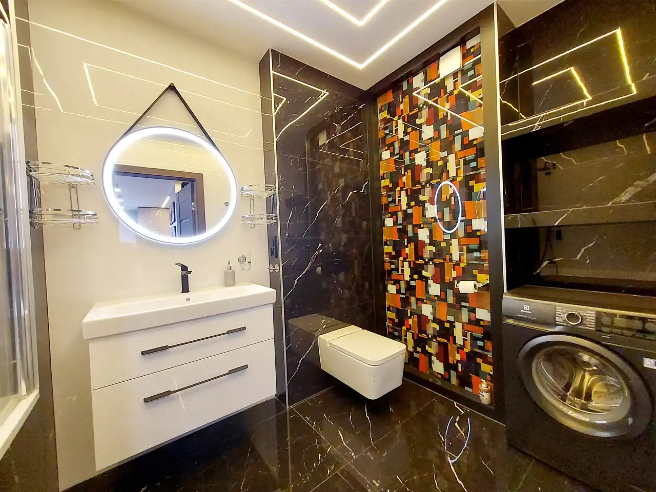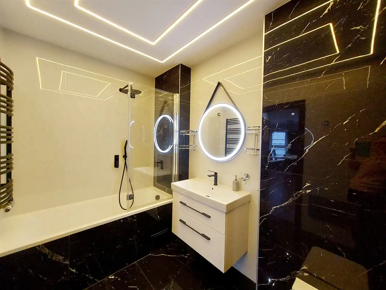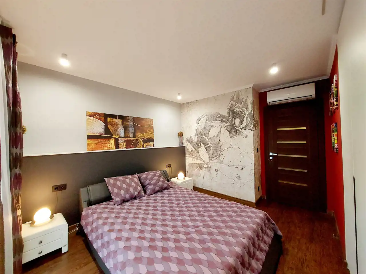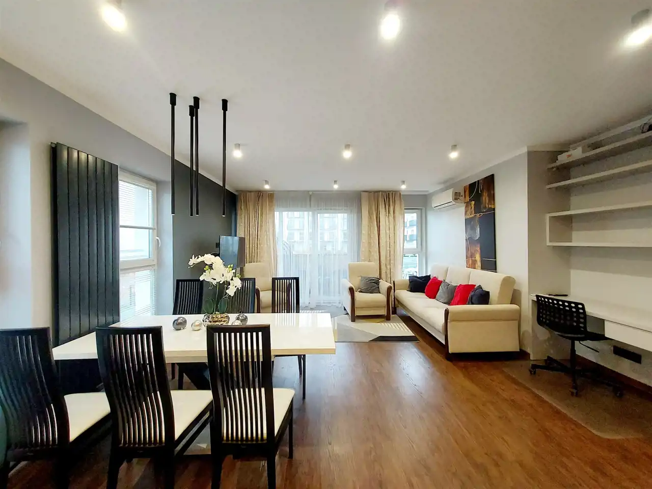 Nieruchomość składa się z salonu z aneksem kuchennym oraz z wyjściem na balkon, sypialni, łazienki oraz przedpokoju. W pokojach zamontowana klimatyzacja. W sypialni i w przedpokoju pojemne szafy w zabudowie. Kuchnia w zabudowie wraz ze sprzętem agd (płyta indukcyjna, piekarnik, okap, lodówko-zamrażarka).