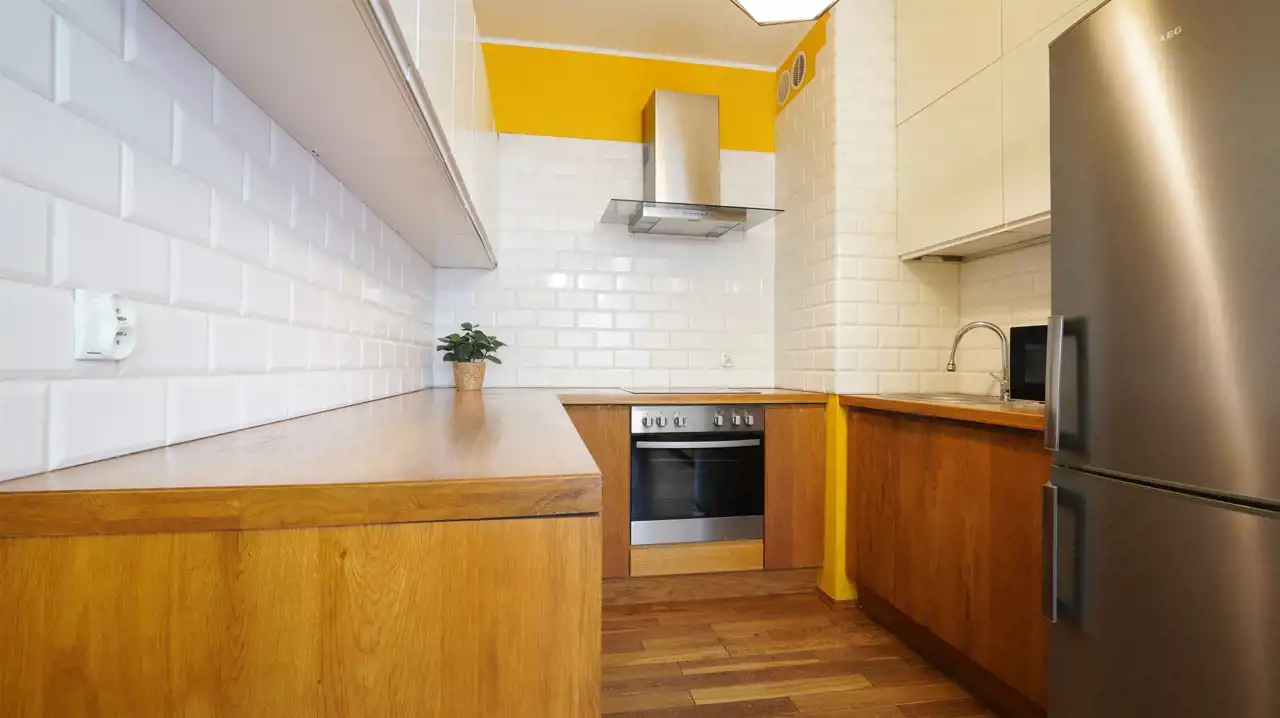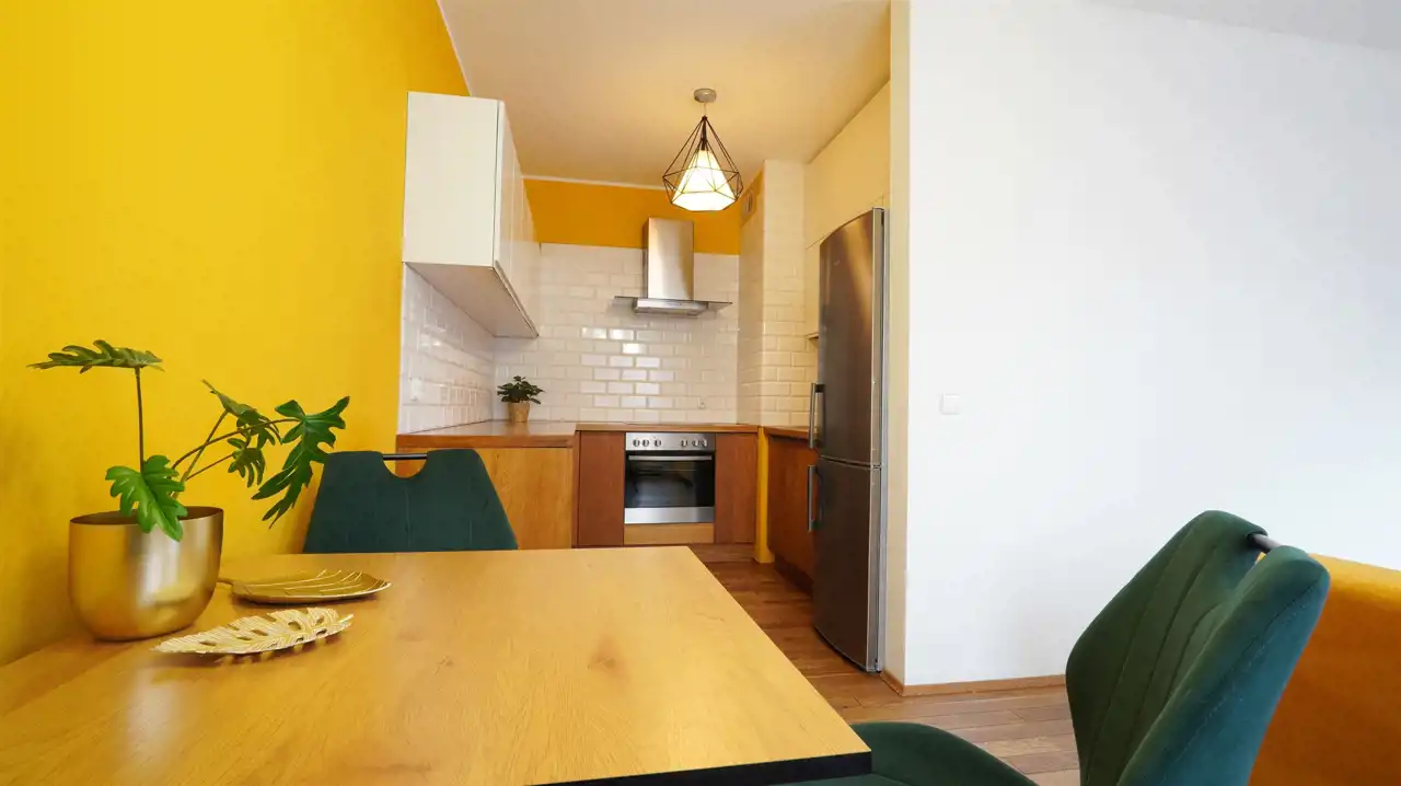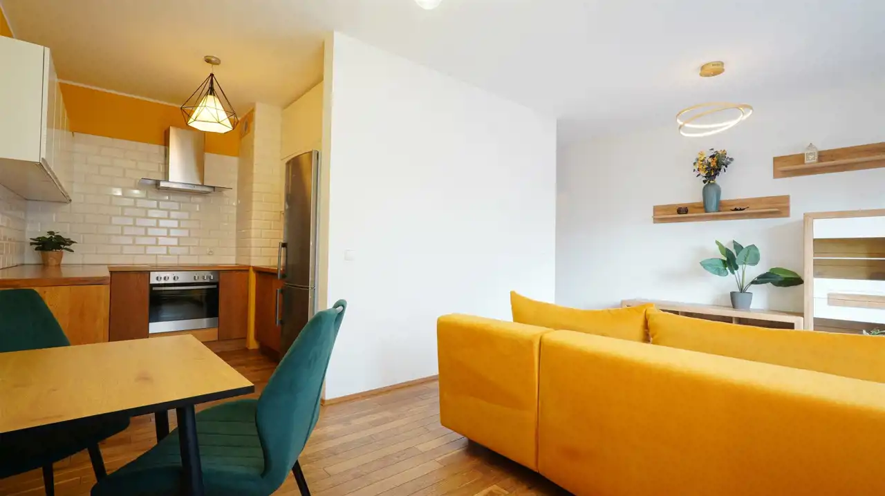- Przestronny salon z dużym aneksem kuchennym – kuchnia wyposażona w meble na wymiar oraz wysokiej klasy sprzęt AGD (płyta indukcyjna, zmywarka, okap). Układ pomieszczenia daje unikalną możliwość wydzielenia osobnej kuchni, jeśli wolisz tradycyjny podział.