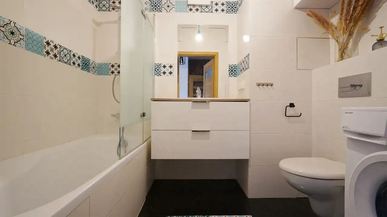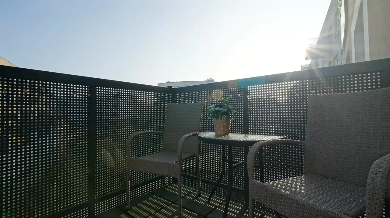 - Słoneczny balkon – idealne miejsce na poranną kawę z przyjemnym widokiem na osiedlową zieleń i architekturę.