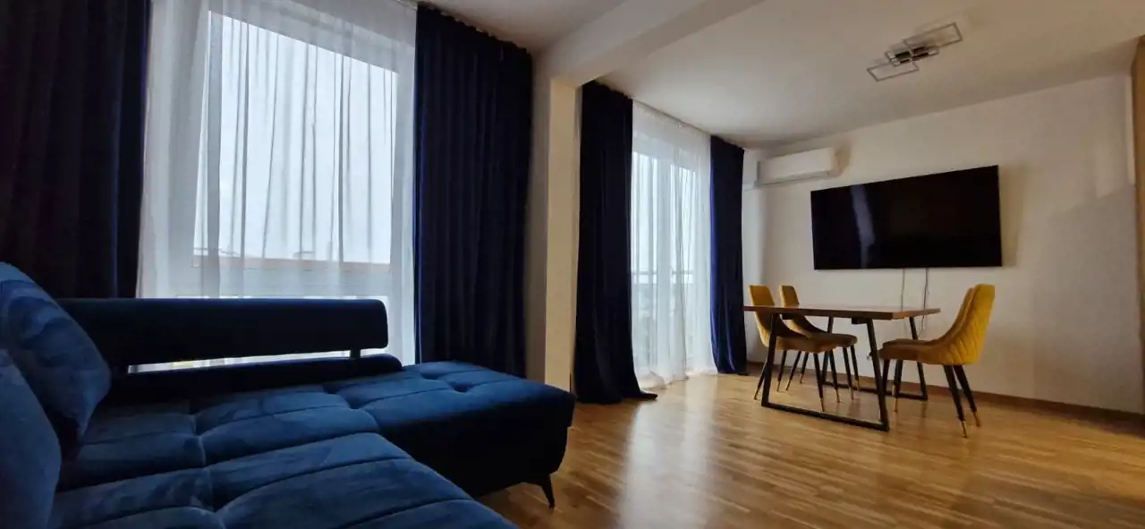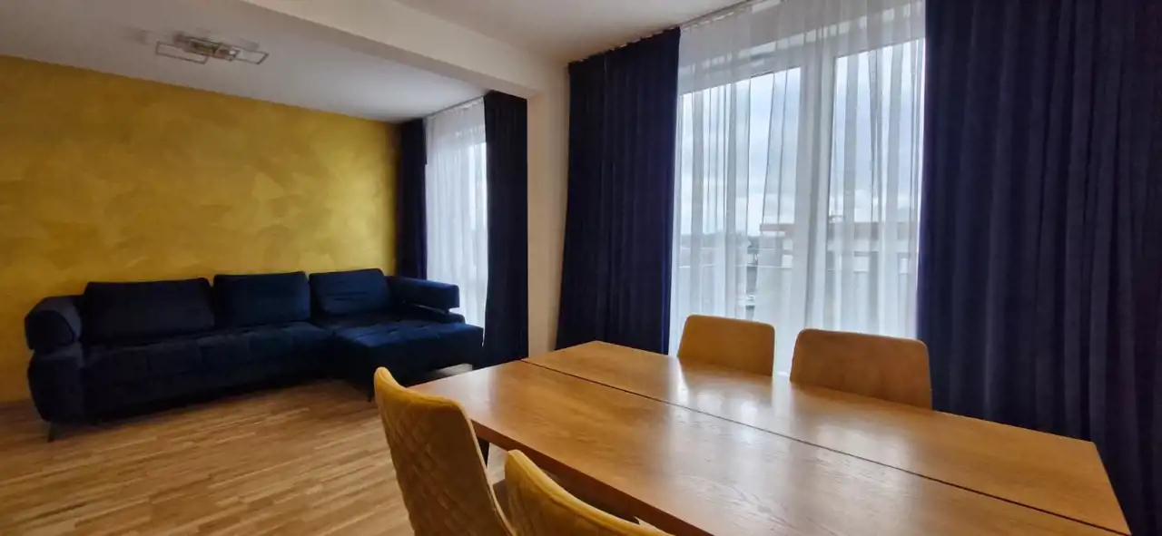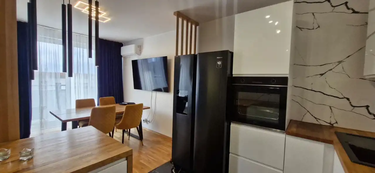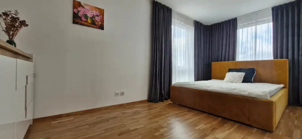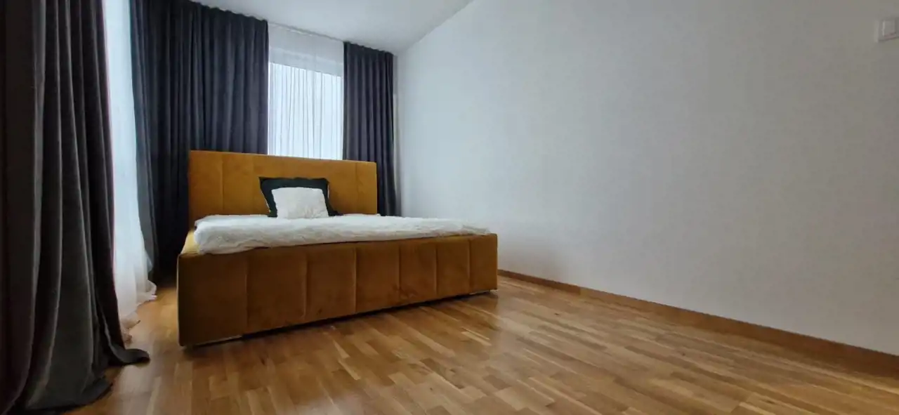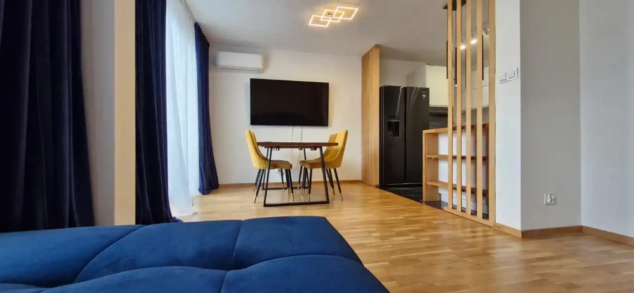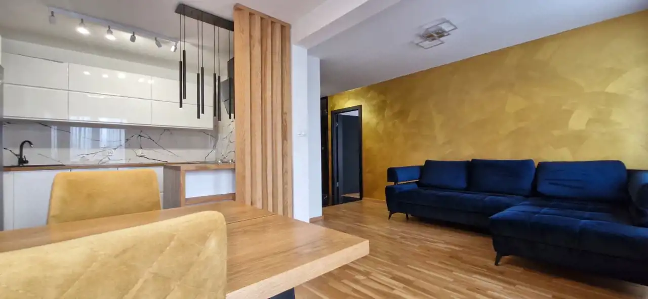 Mieszkanie wykończone z użyciem materiałów premium, bardzo czyste, zadbane i ergonomicznie zaprojektowane. W salonie i sypialni znajdują się drewniane podłogi, dodające wnętrzu elegancji i przytulności.