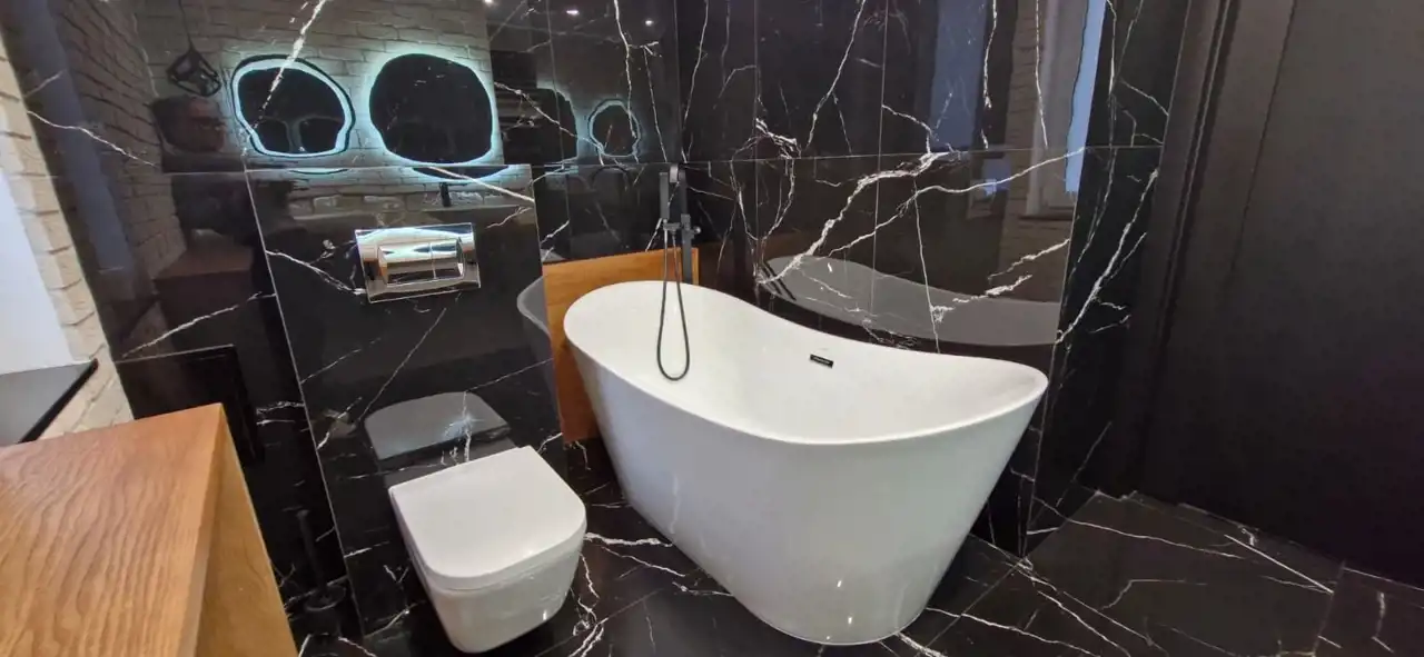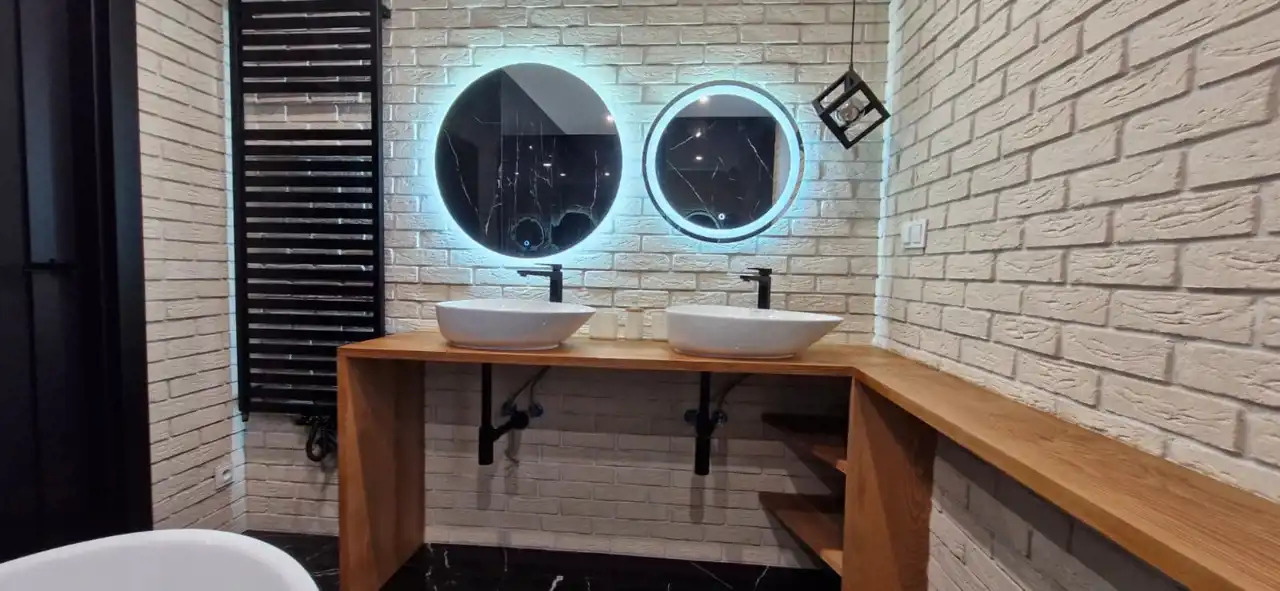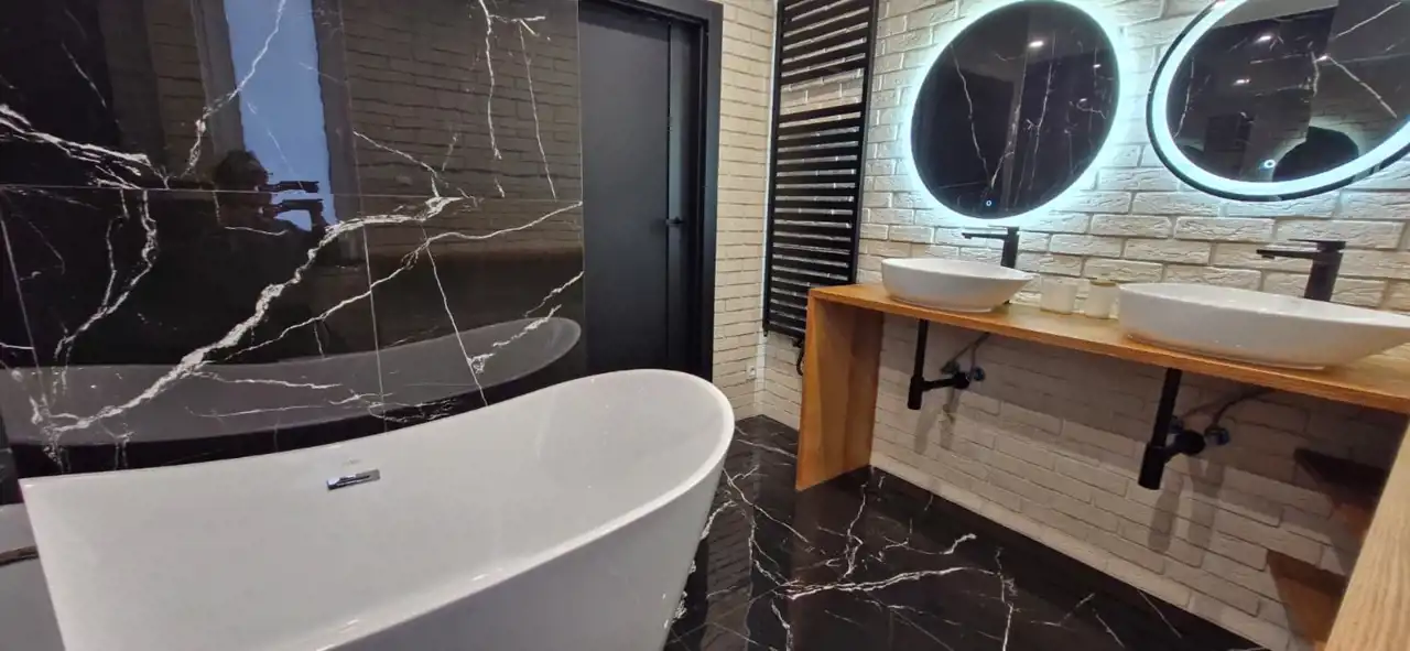 łazienka: wysokiej klasy armatura, stylowa wanna, dwie umywalki.