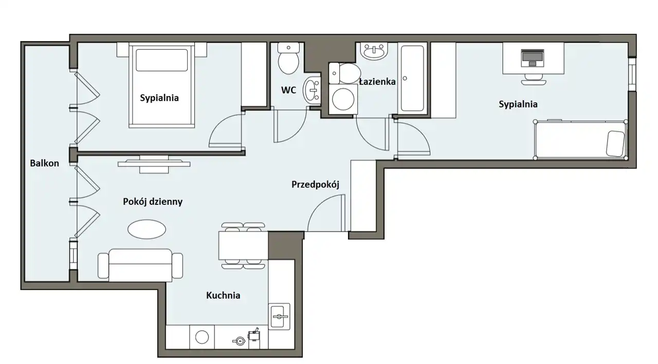 - Charakterystyka mieszkania 64.6 m2, 3 pokoje