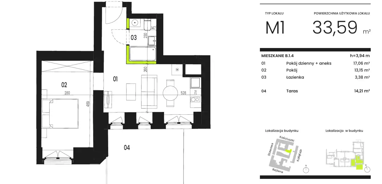 - Charakterystyka mieszkania 33.59 m2, 2 pokoje