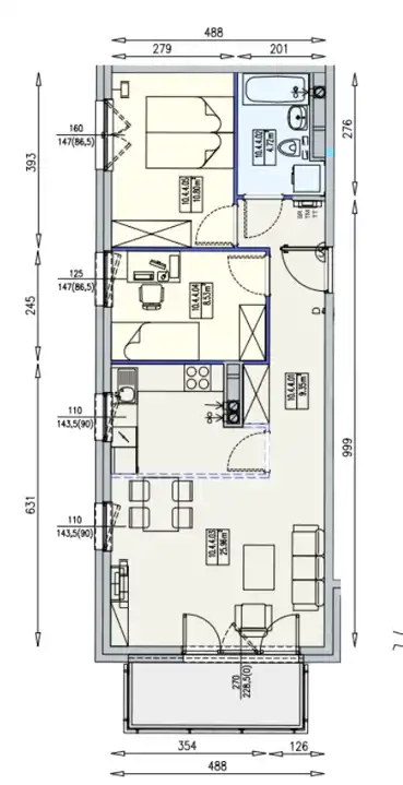 - Charakterystyka mieszkania 59.4 m2, 3 pokoje