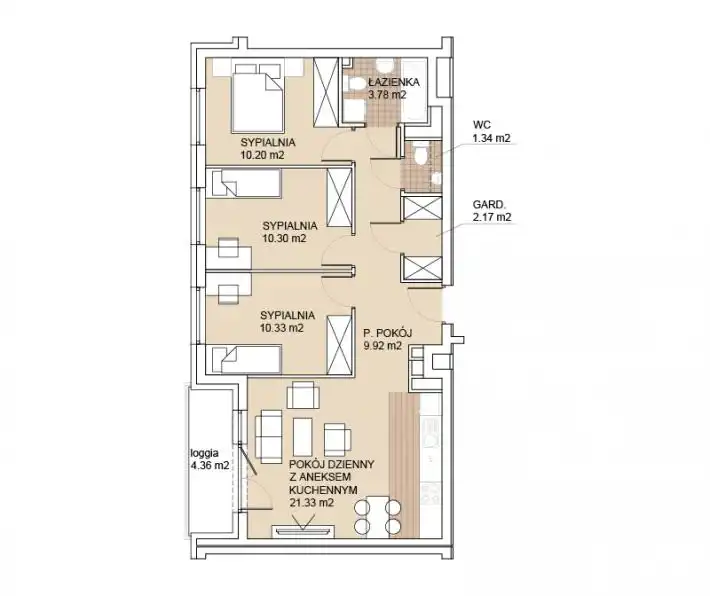Mieszkanie składa się z przestronnego pokoju dziennego z aneksem kuchennym, 3 sypialni,garderoby, przedpokoju, łazienki, wc oraz dodatkowo balkonu.
