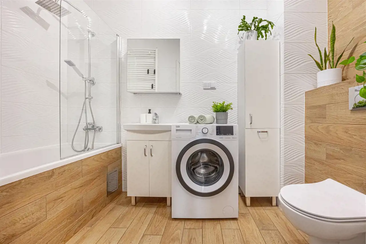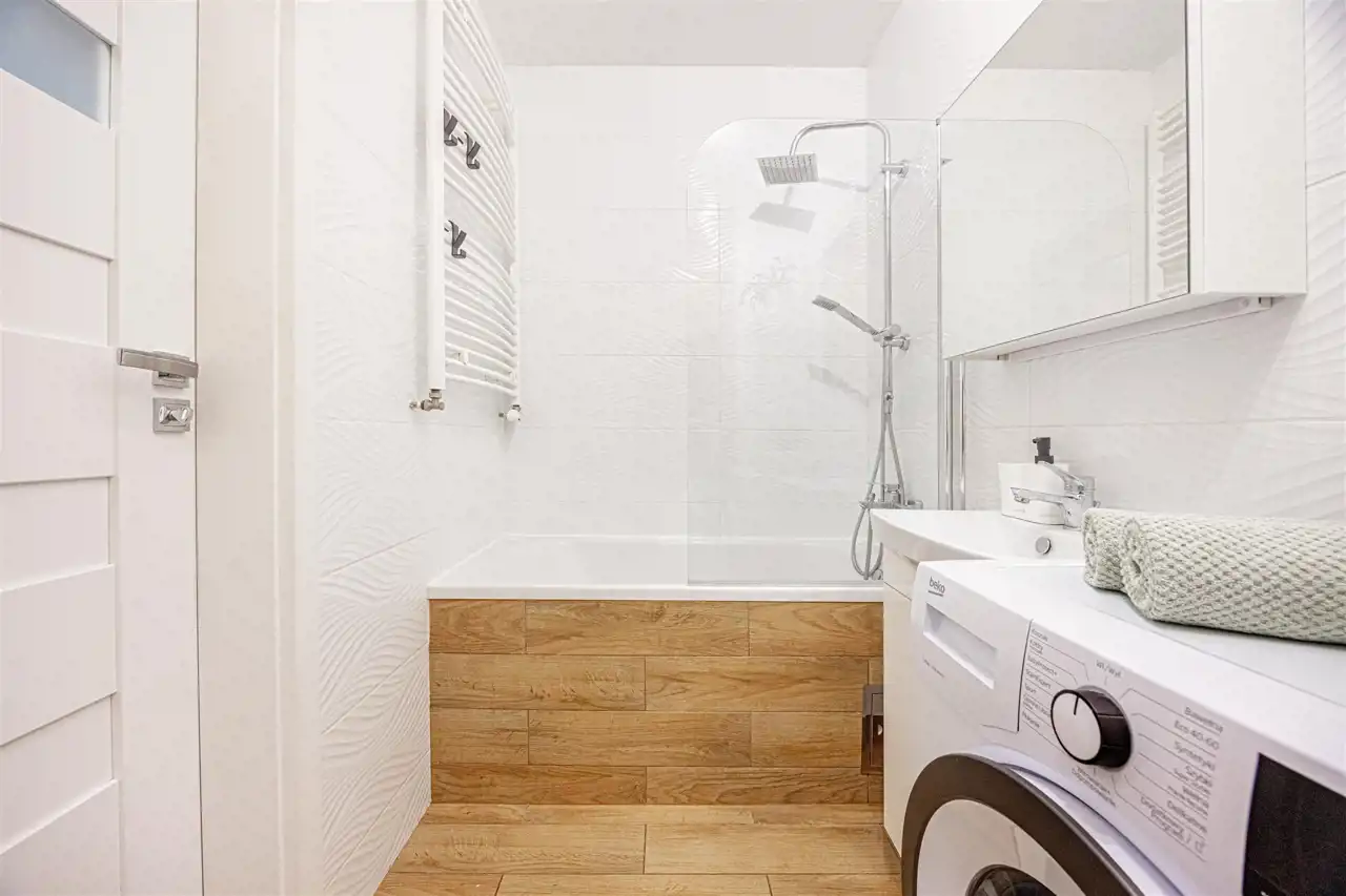 - łazienki wyposażonej w wannę z funkcją prysznica, umywalkę, szafki do przechowywania, pralką oraz toaletę