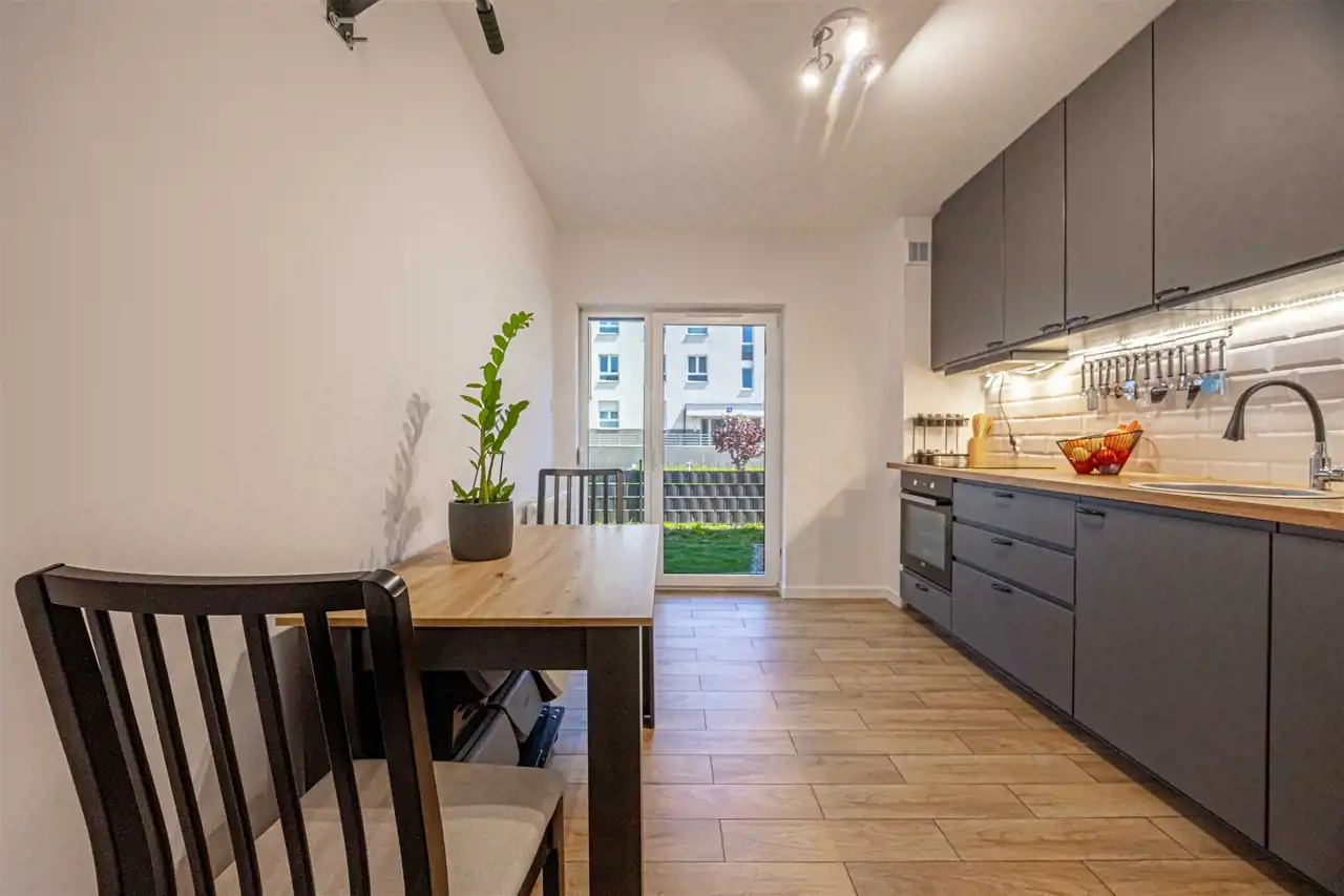 - osobnej kuchnia z wyjściem na ogródek wyposażonej w meble w zabudowie, stół z dwoma krzesłami. Całość dopełnia nowoczesny sprzęt AGD w tym: płyta indukcyjna, piekarnik elektryczny, okap kuchenny, lodówka z zamrażarką, zmywarka