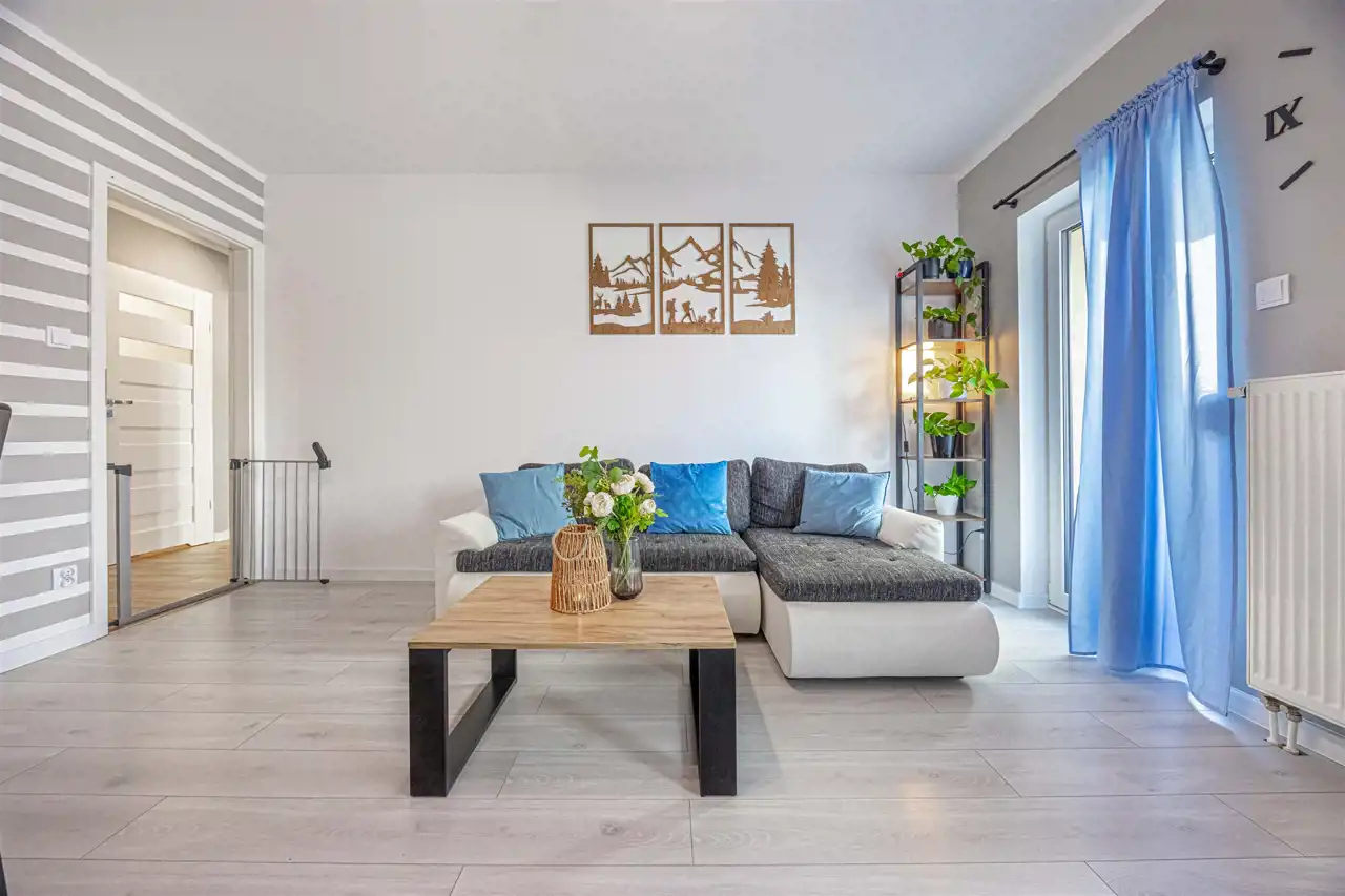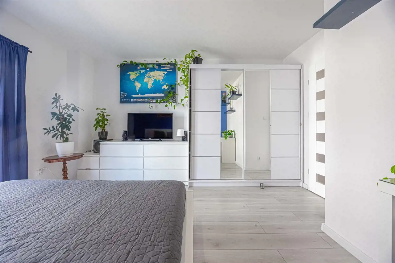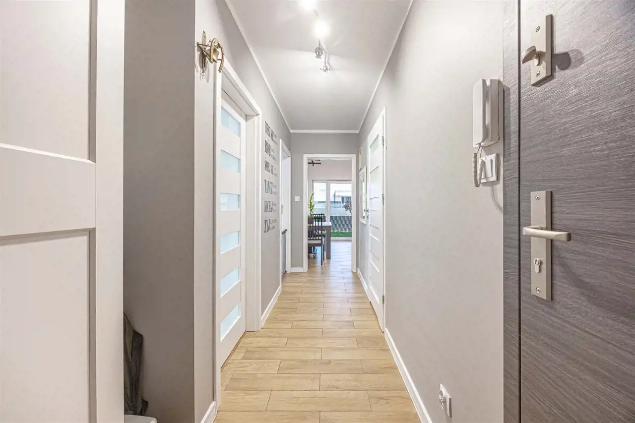 Całe mieszkanie zostało wykończone z dbałością o detale – na podłogach położono gres w odcieniach drewna oraz panele w nowoczesnej, szarej kolorystyce. Zamontowano nową stolarkę drzwiową, a w oknach i drzwiach tarasowych zainstalowano zewnętrzne żaluzje, które zapewniają komfort, prywatność i bezpieczeństwo.