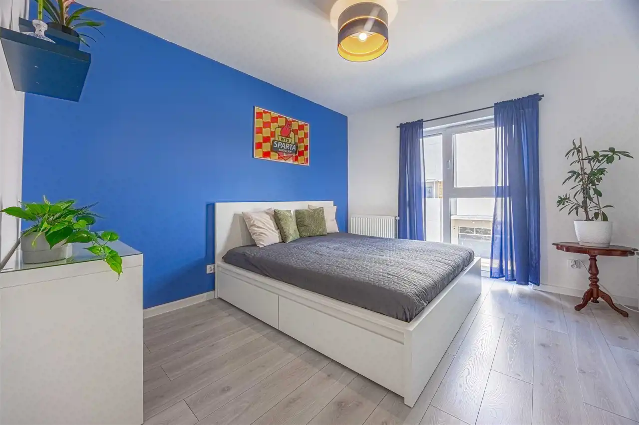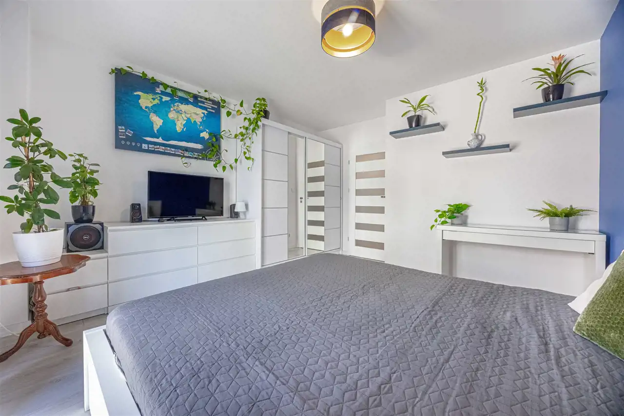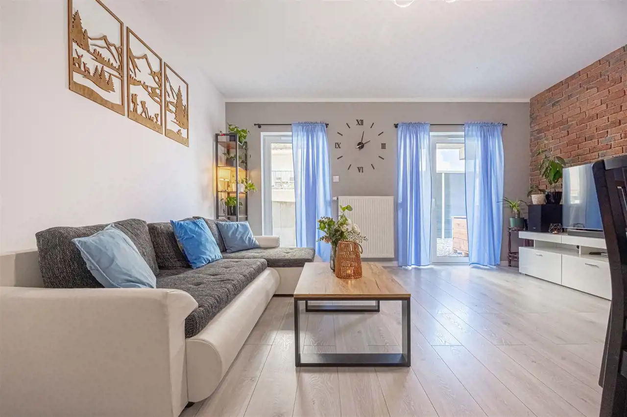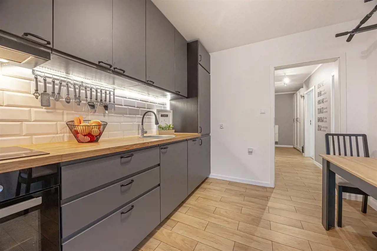 Całe mieszkanie zostało wykończone z dbałością o detale – na podłogach położono gres w odcieniach drewna oraz panele w nowoczesnej, szarej kolorystyce. Zamontowano nową stolarkę drzwiową, a w oknach i drzwiach tarasowych zainstalowano zewnętrzne żaluzje, które zapewniają komfort, prywatność i bezpieczeństwo.