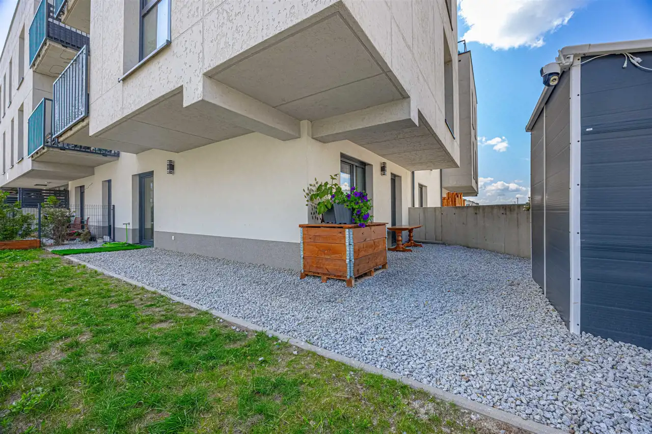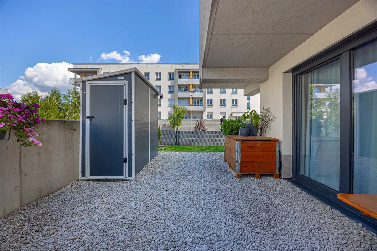 - ponad 58 m2 ogródka pełniącego funkcję dodatkowej przestrzeni użytkowej, miejsca do wypoczynku z wolnostojącą komórką lokatorską