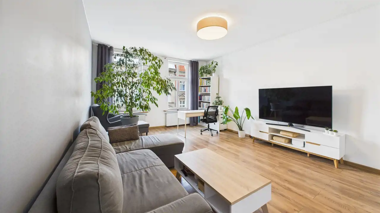 salon (23 m²) – jasny, przestronny, z narożnikiem, TV 65", biurkiem i komodą