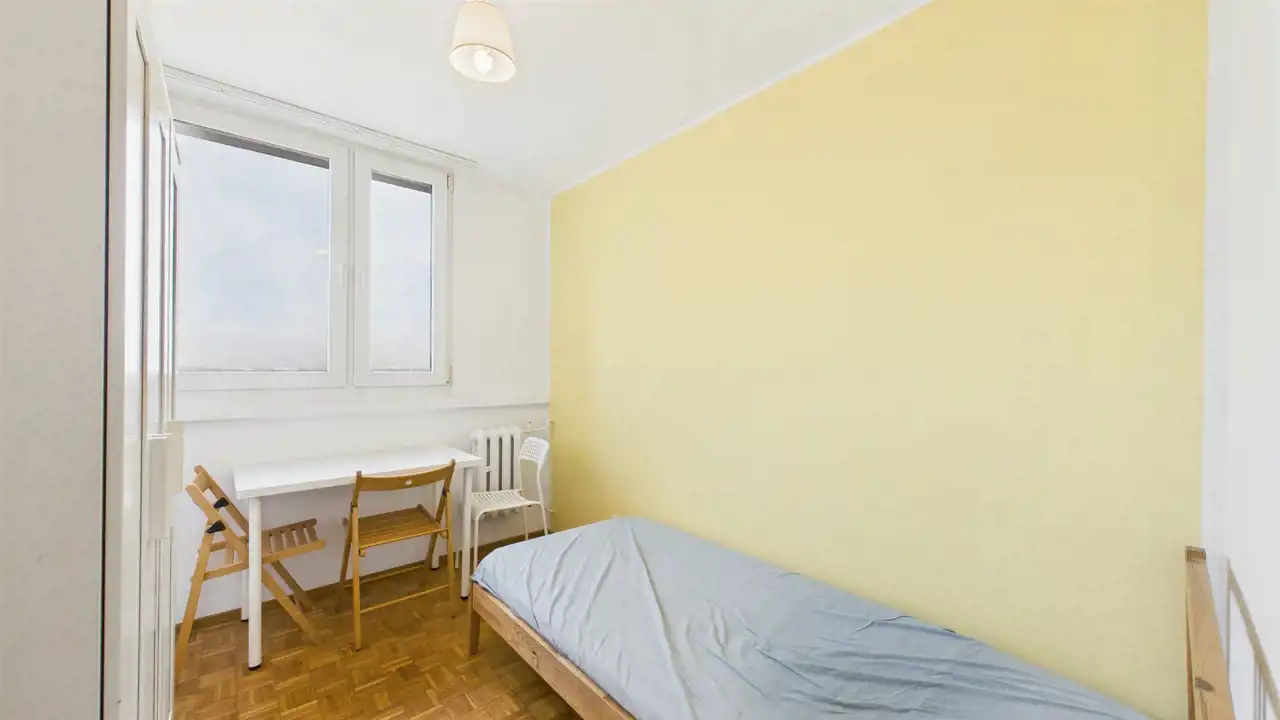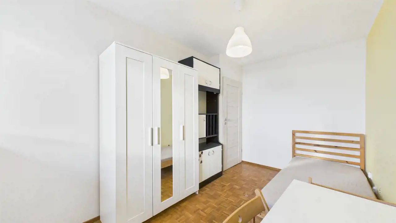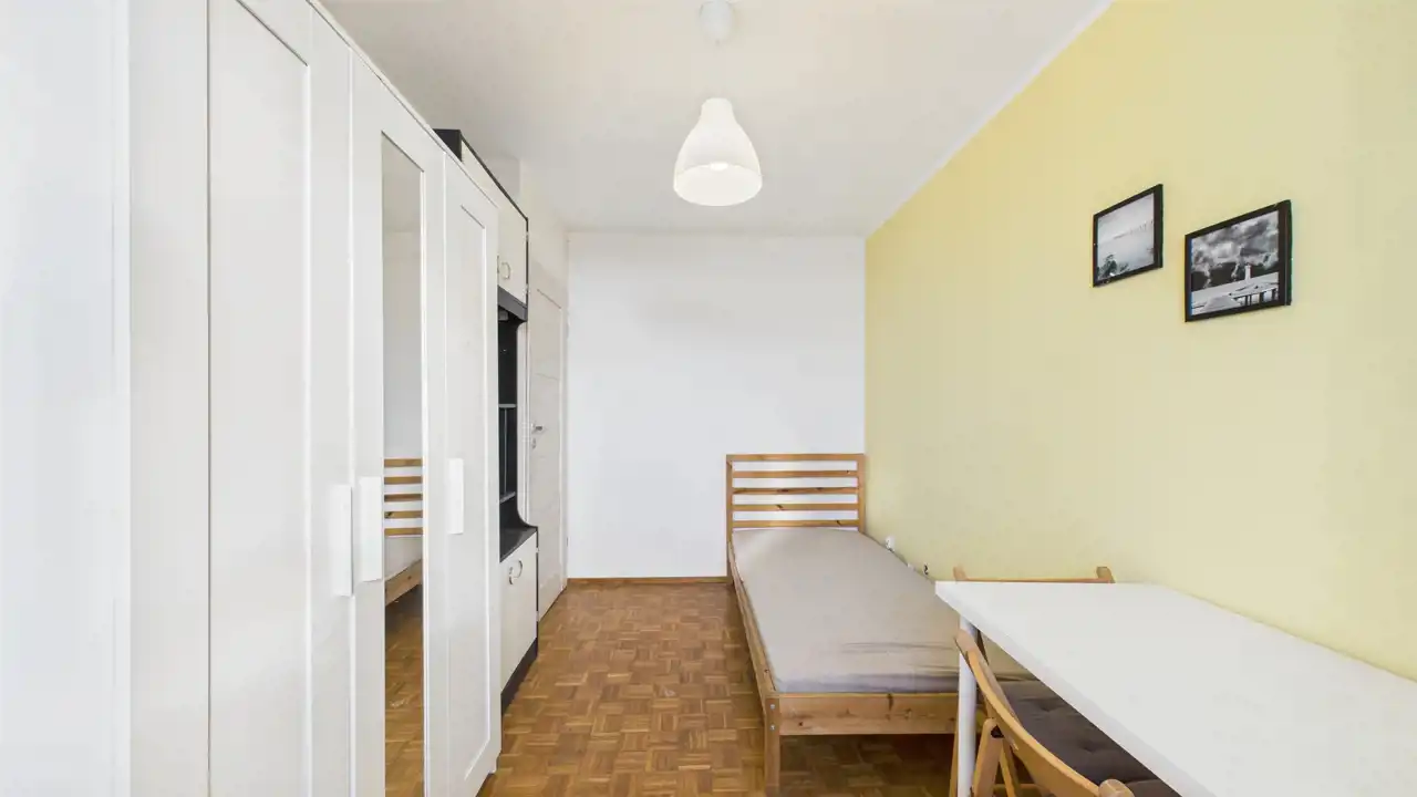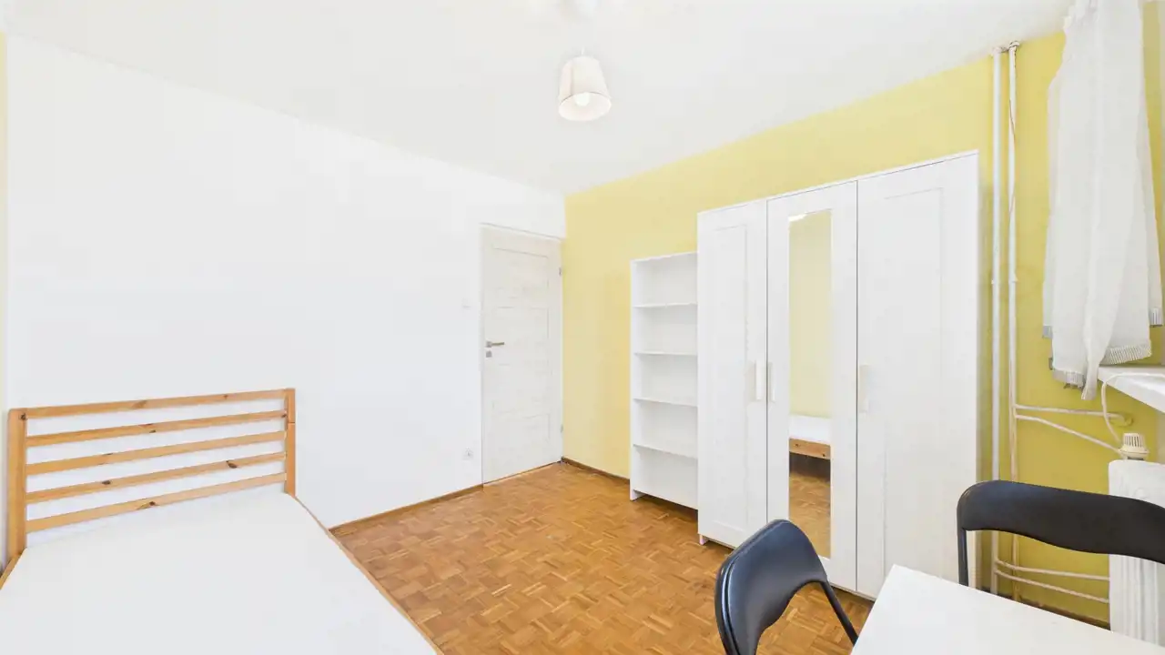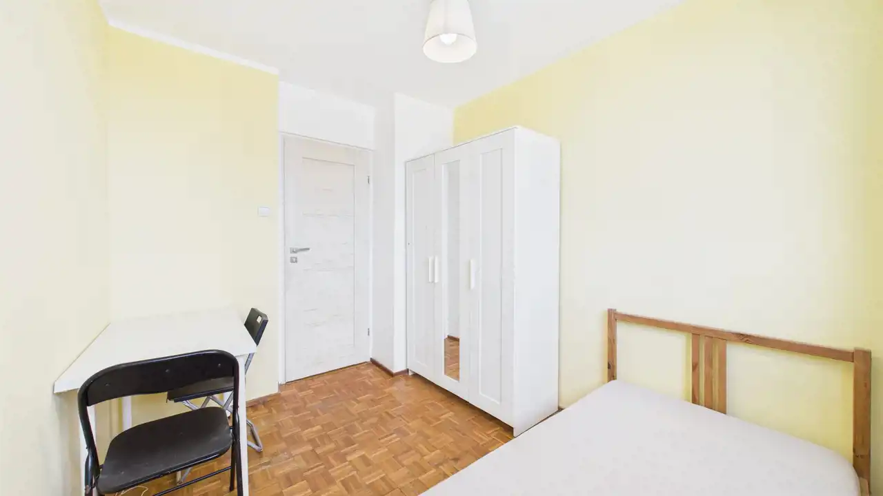 każdy pokój wyposażony w łóżko, szafę oraz stolik z krzesłami