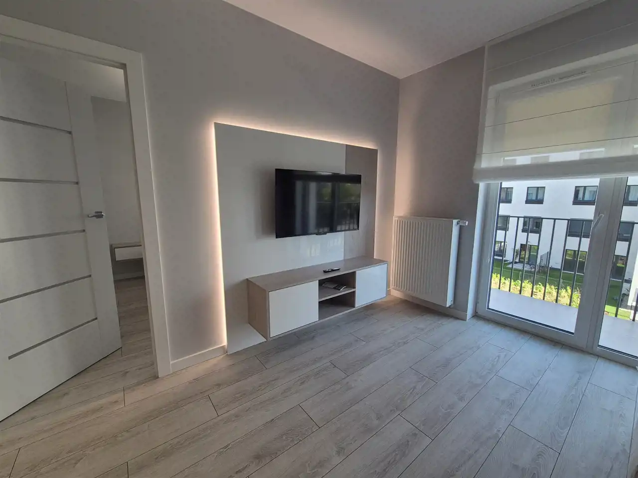 Salon w pełni umeblowany i wyposażony z wyjściem na balkon.
