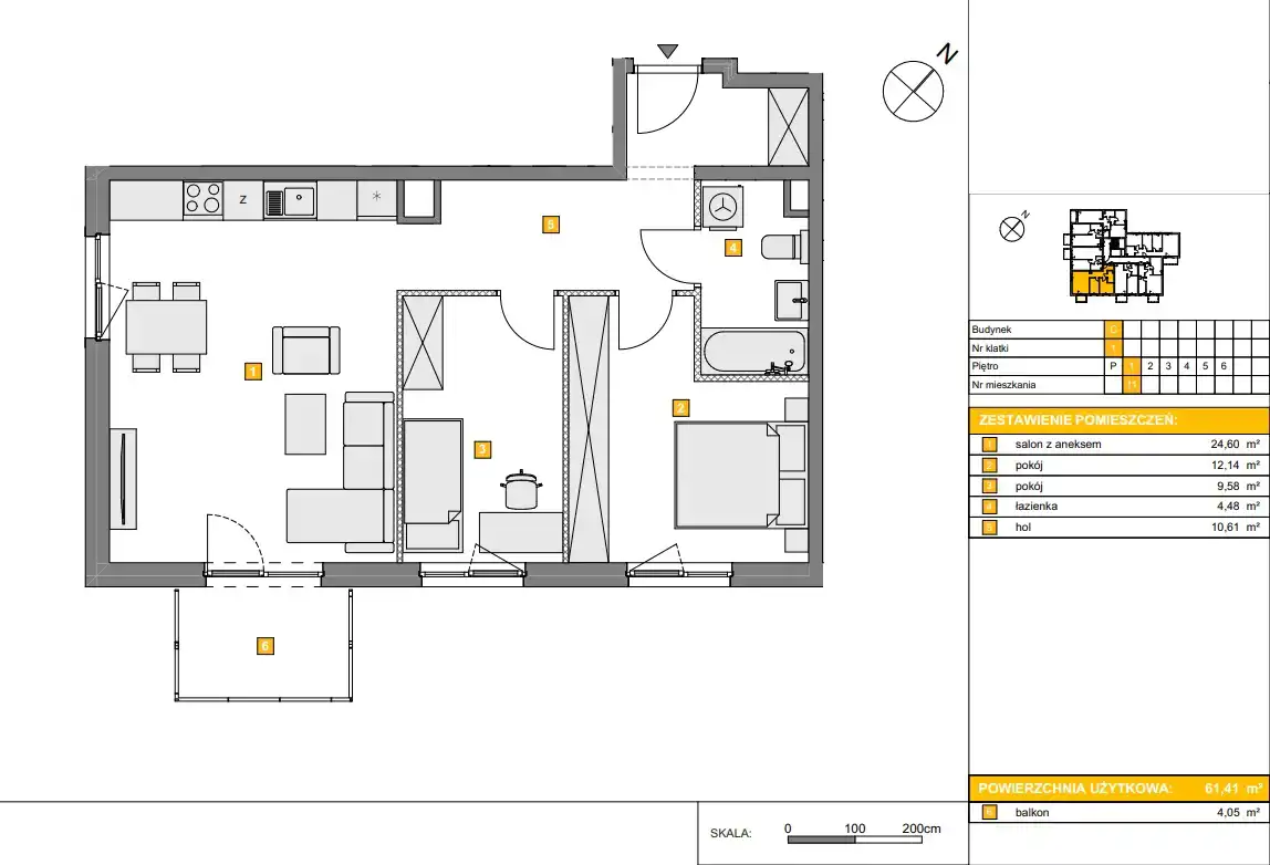 - Charakterystyka mieszkania 61.41 m2, 3 pokoje