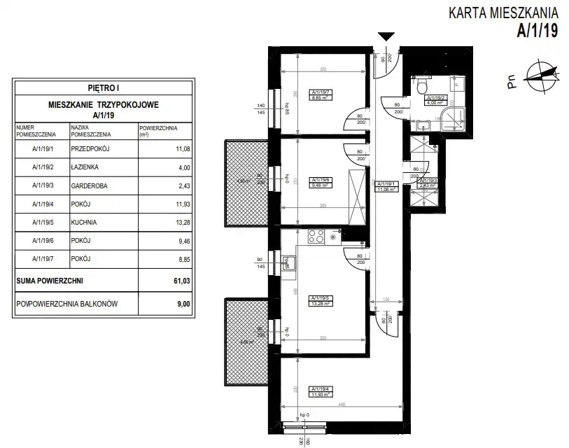 - Charakterystyka mieszkania 61.03 m2, 3 pokoje