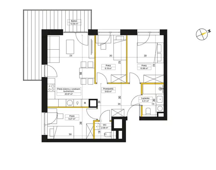 Mieszkanie składa się z przestronnego salonu z aneksem kuchennym , 3 sypialni, ustawnego przedpokoju, łazienki, wc oraz dodatkowo tarasu(14 m2)