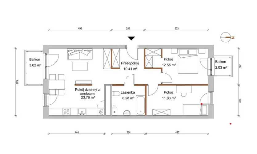 pokój dzienny z aneksem kuchennym – 23,76 m² z wyjściem na balkon