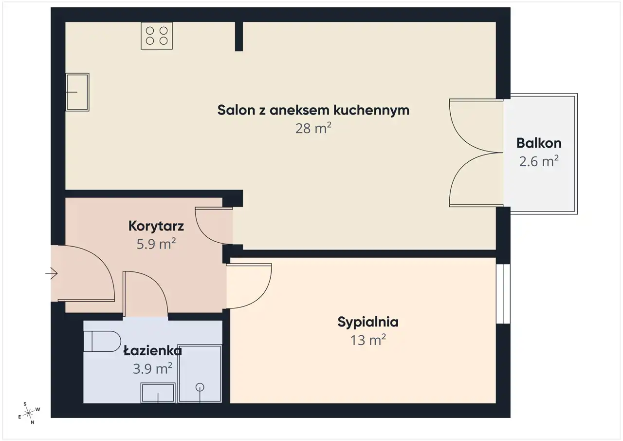 - przestronny salon z aneksem kuchennym,