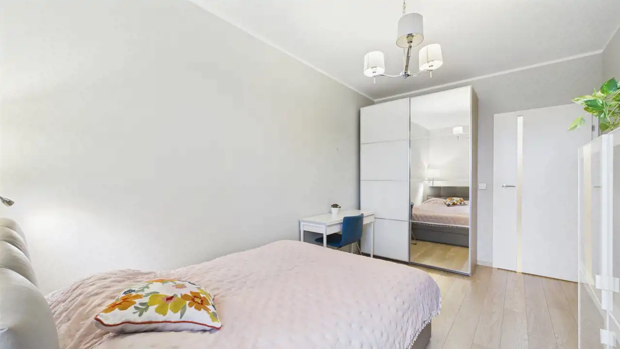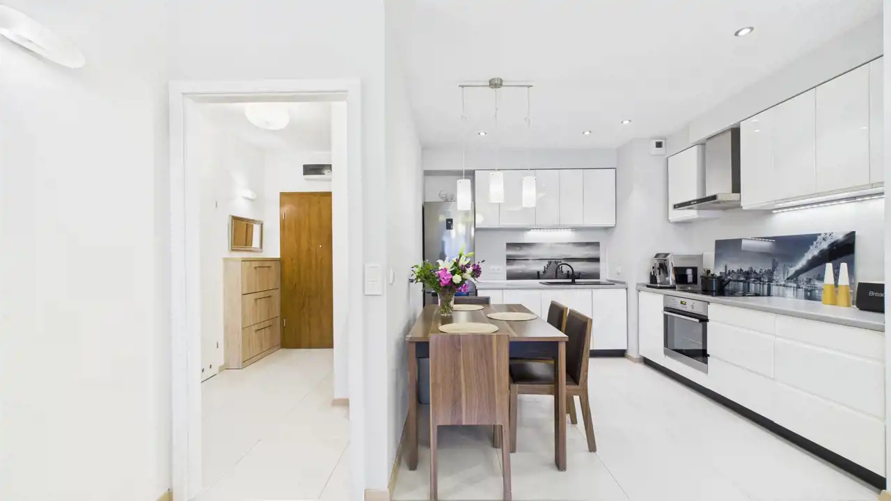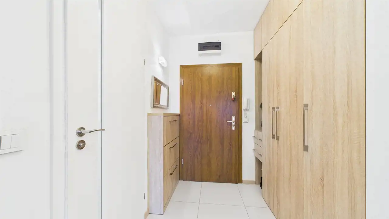 - funkcjonalna zabudowa kuchenna ze sprzętem AGD oraz pojemna szafa w zabudowie w przedpokoju, ułatwiające codzienne użytkowanie i organizację przestrzeni
