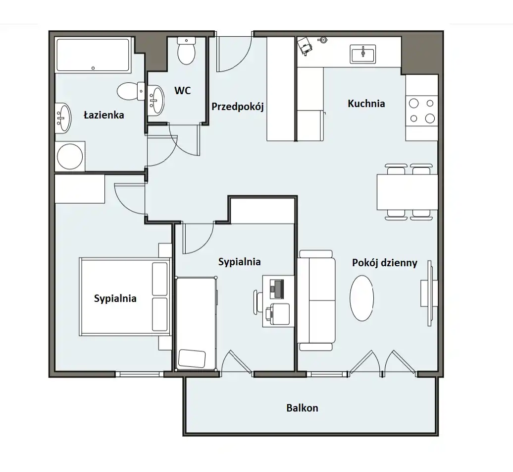 - duży balkon na długość całego mieszkania z wyjściem z każdego pokoju