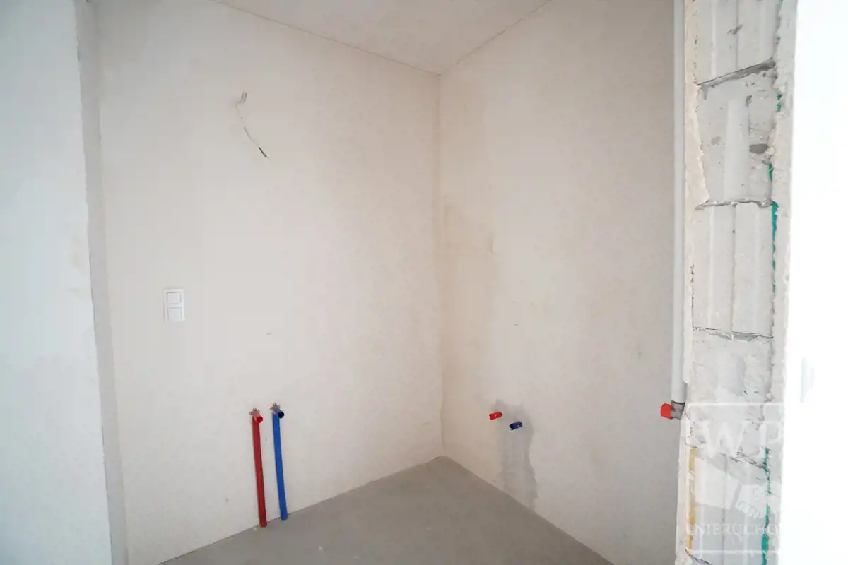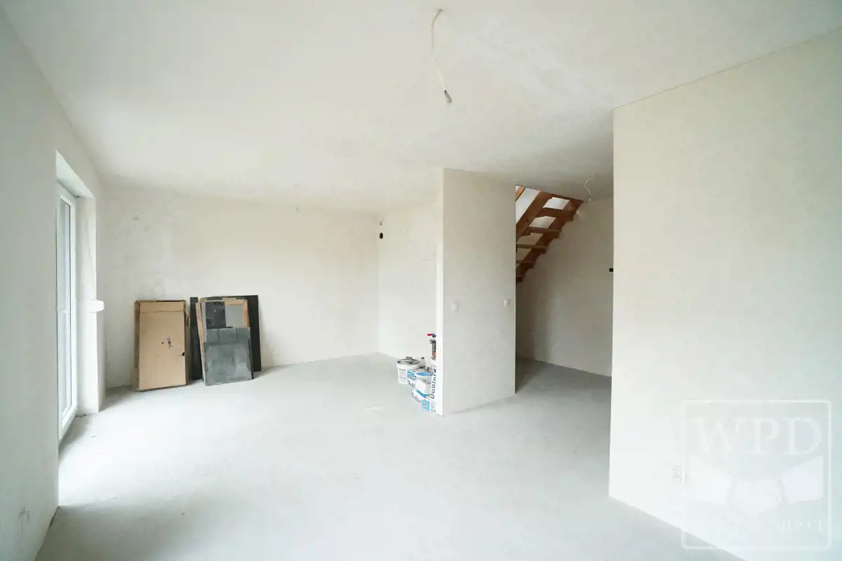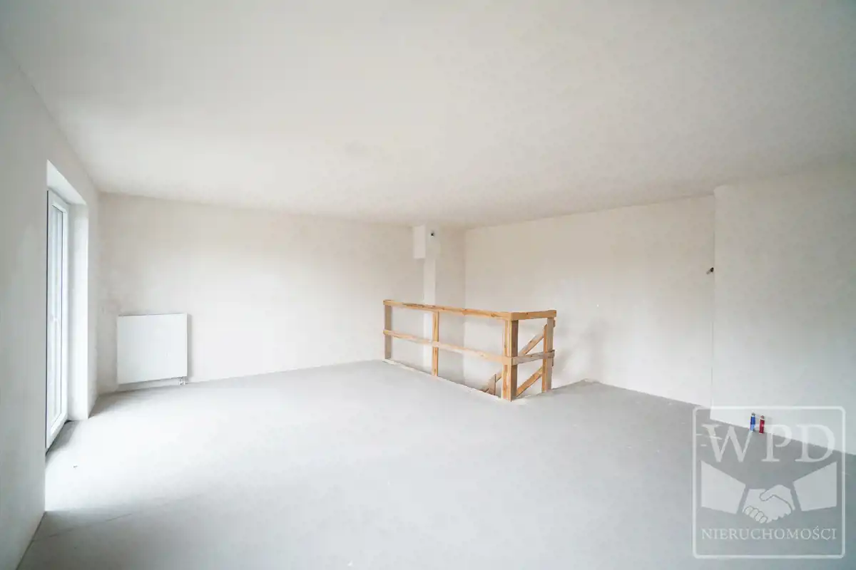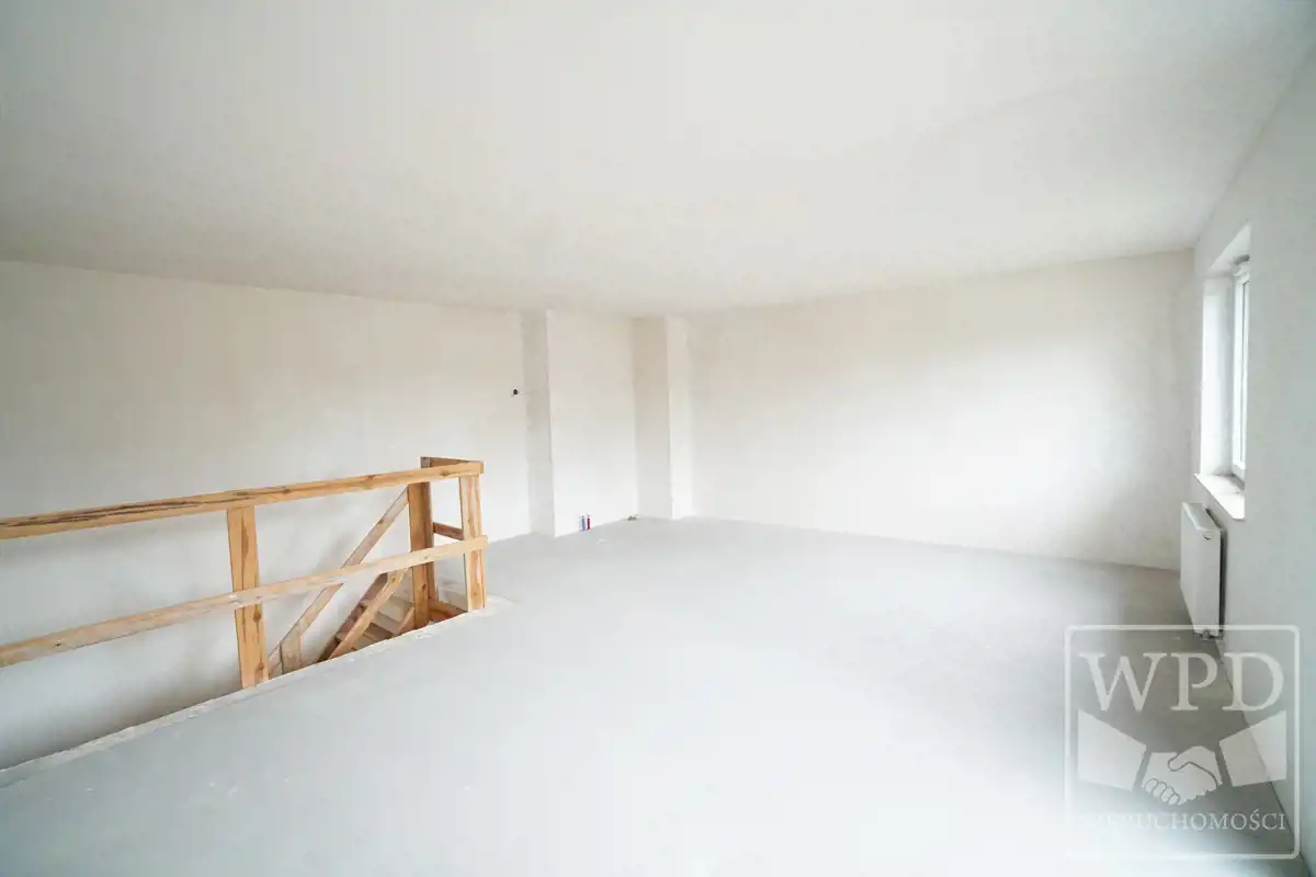 Na drugim poziomie znajdziemy pustą przestrzeń, która została przygotowana pod możliwość wydzielenia miejsca na łazienkę, dwa pokoje w tym jeden z balkonem oraz przedpokój.