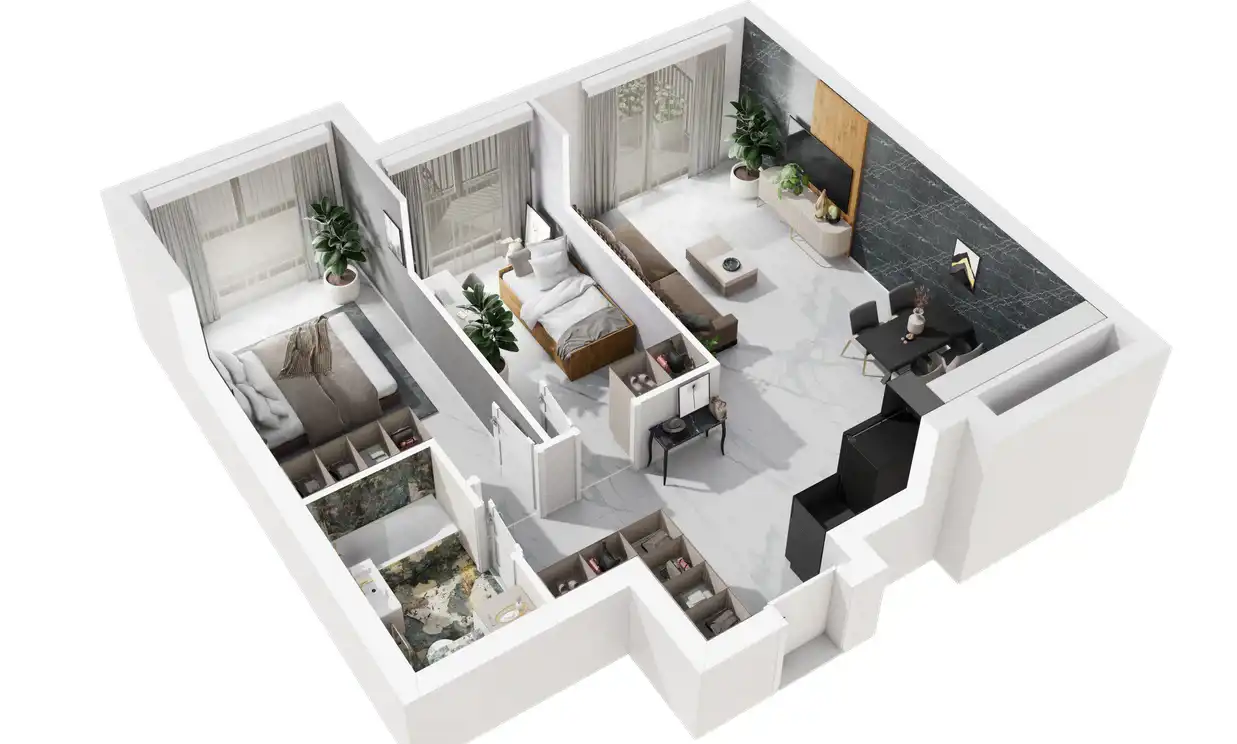 Mieszkanie oferuje jasną, komfortową przestrzeń z pięknym porannym światłem. Duży salon z aneksem i szerokimi przeszkleniami tworzy idealne miejsce do odpoczynku i spotkań. Dwie sypialnie pozwalają wygodnie zaaranżować przestrzeń zarówno dla rodziny, jak i osób pracujących zdalnie. Balkon o ponadprzeciętnej powierzchni zapewnia dodatkową przestrzeń rekreacyjną.