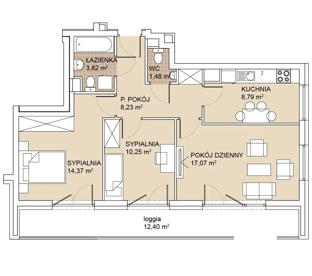 - Serce mieszkania: Przestronny Salon (17,07 m²) i dwie ustawne Sypialnie (14,37 m² i 10,25 m²) – zapewniają prywatność i komfort dla każdego członka rodziny.
