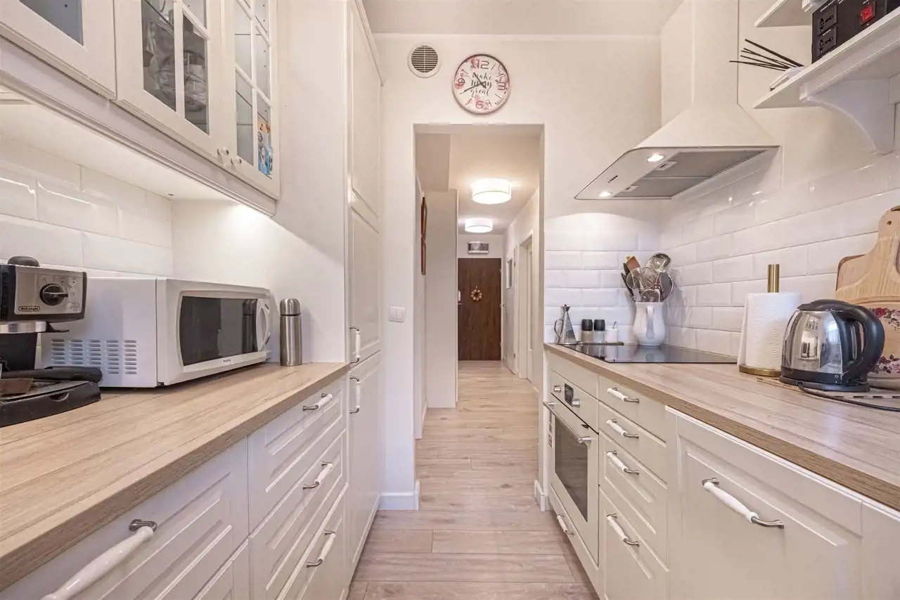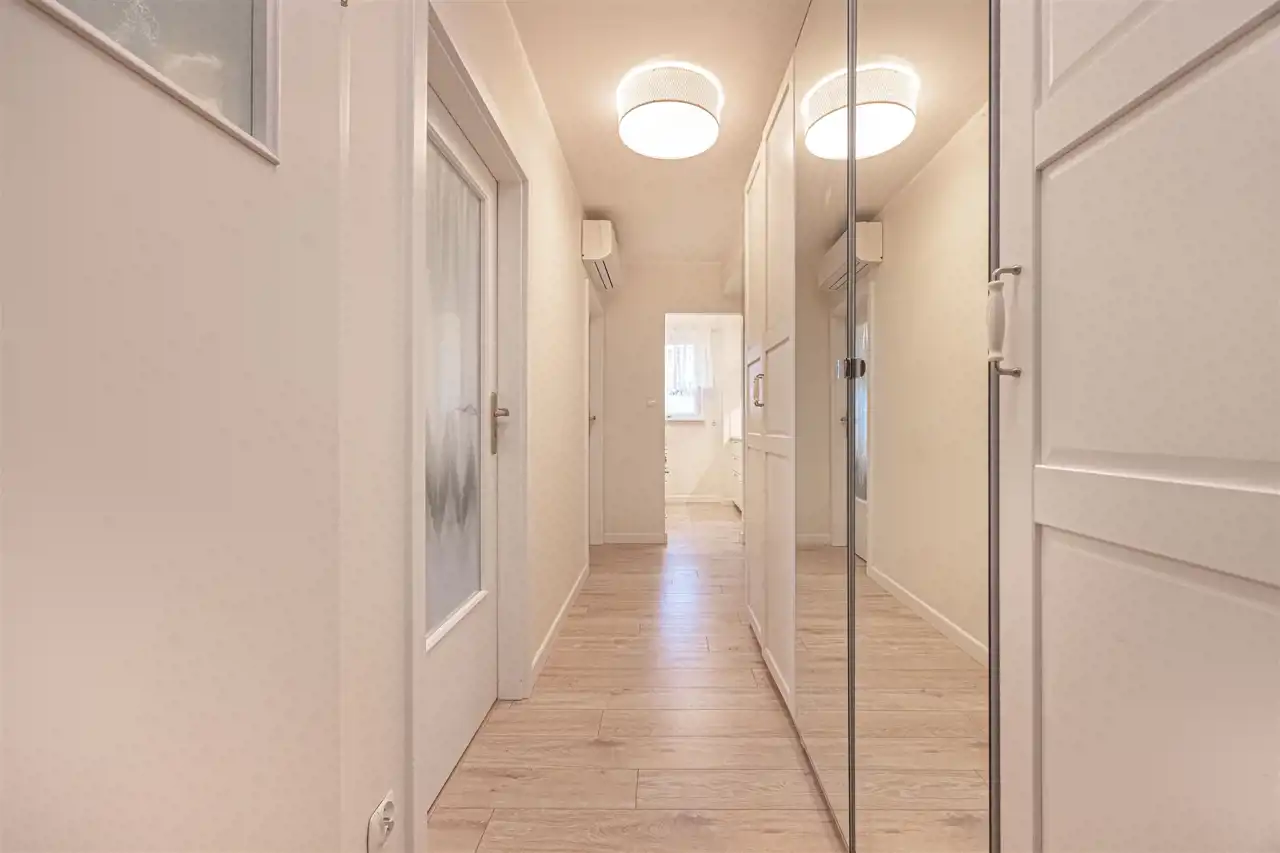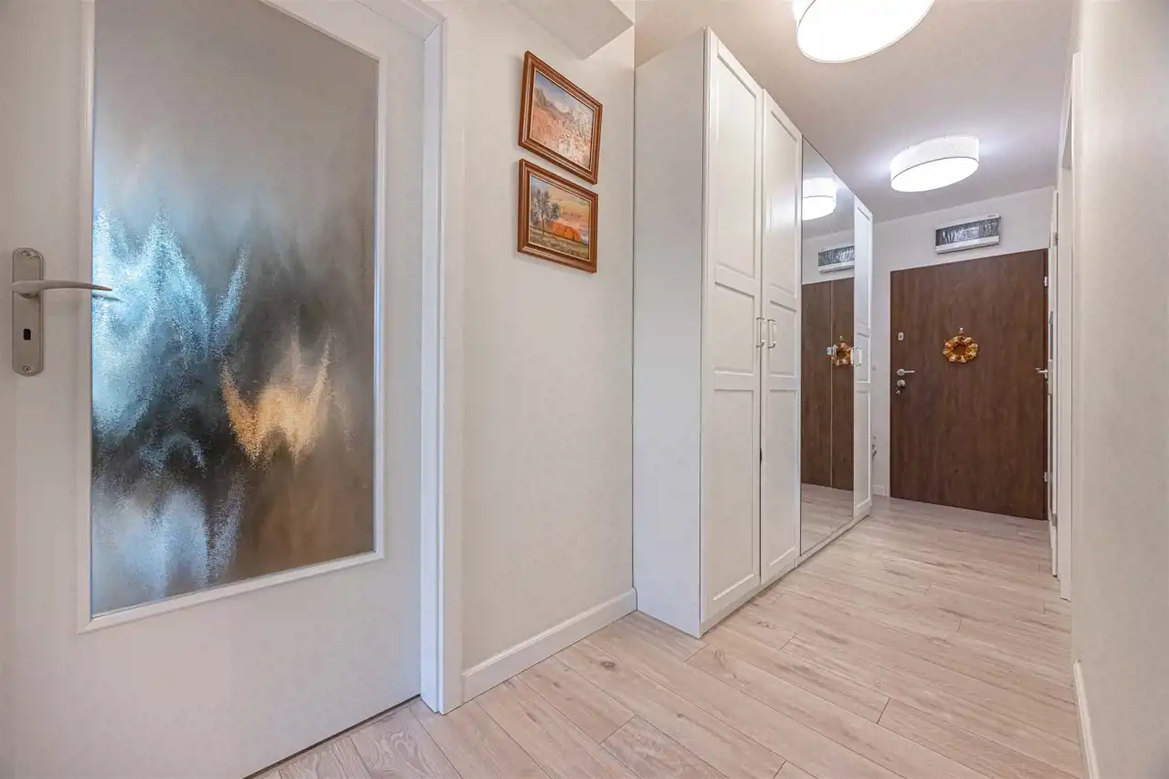 Dwustronne mieszkanie o jasnych i przestronnych wnętrzach i ciekawym układzie pomieszczeń. Składa się z przedpokoju z dużą szafą, 3 pokoi, w tym dwóch z balkonami, kuchni oraz łazienki z wanną i WC. W salonie znajduje się część jadalna i wypoczynkowa. Lokal wyposażony w klimatyzację, gotowy do wprowadzenia się, zadbany i gustownie umeblowany, nie wymaga dodatkowych nakładów.