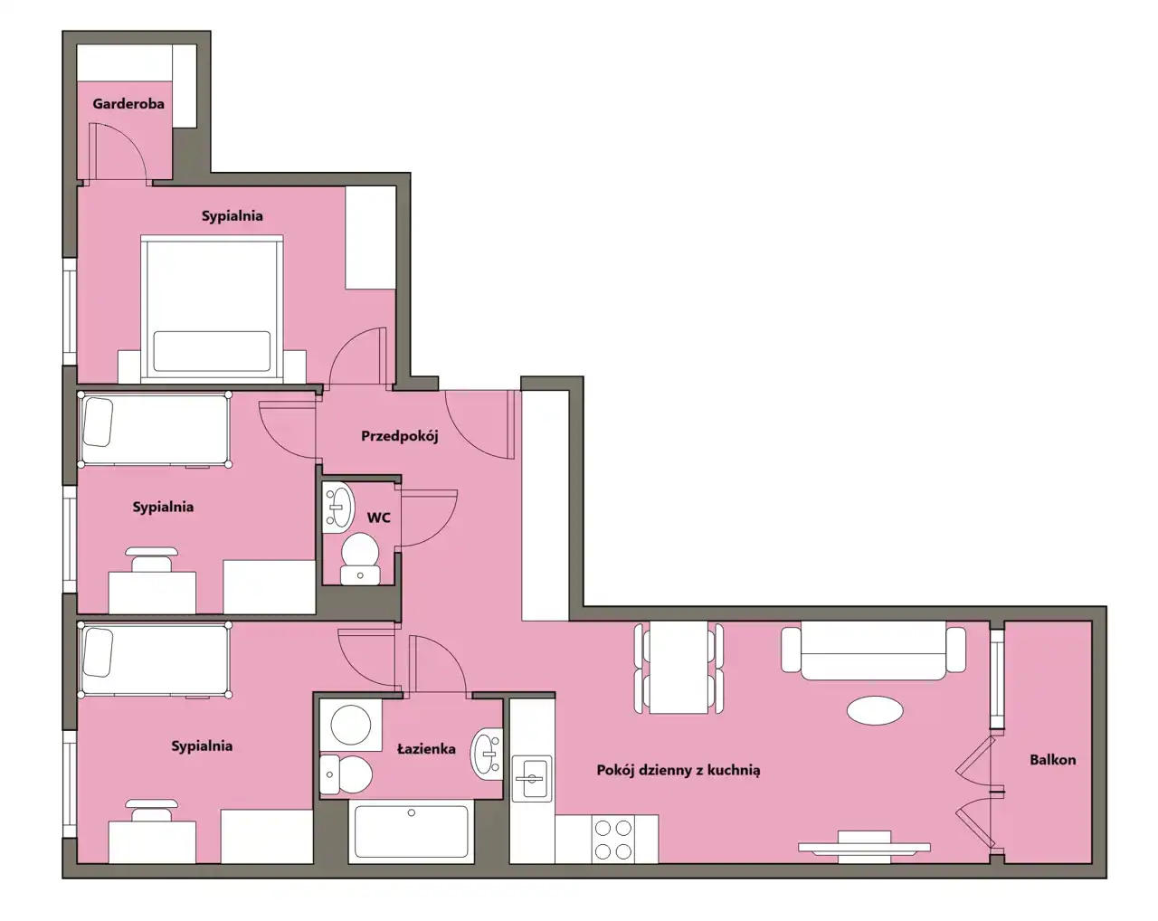 - trzy ustawne sypialnie