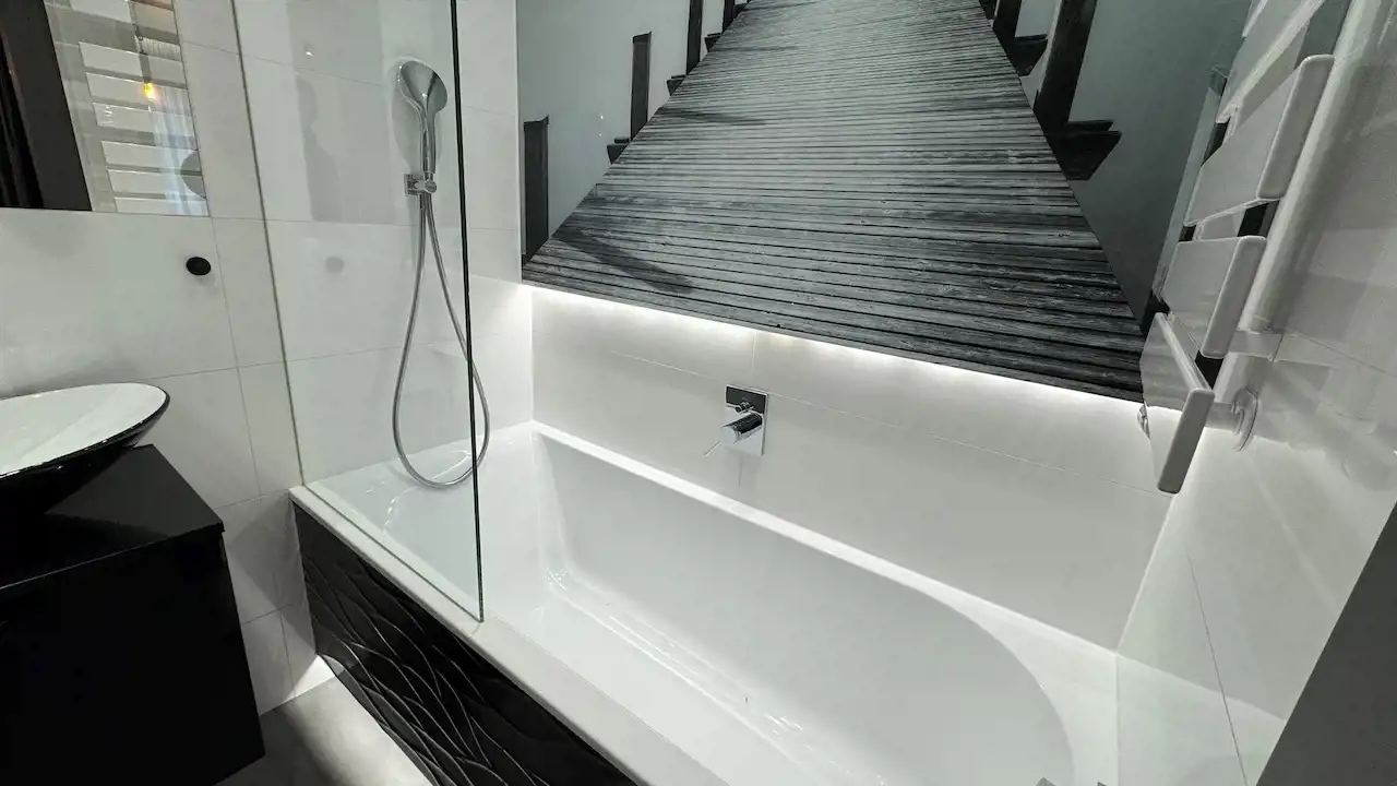 Mieszkanie zostało zaprojektowane z myślą o funkcjonalności. Ukryte szafy oferują mnóstwo miejsca do przechowywania, nie zabierając przestrzeni, co jest szczególnie ważne w przypadku rodzin.