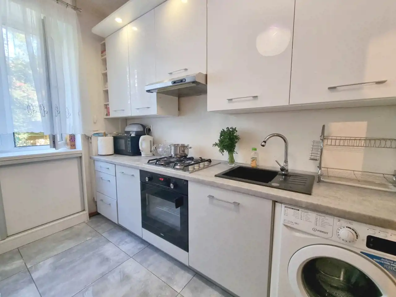W kuchni, łazience, przedpokoju podłogi wykonane są z gustownych kafli.