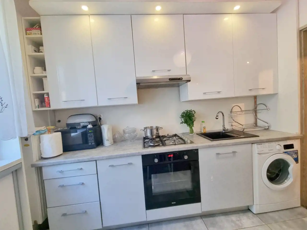 W kuchni stół z krzesłami, okap i zabudowa kuchenna, lodówko-zamrażarka, piekarnik elektryczny i kuchenka gazowa, zmywarka, zlewozmywak z baterią, czyli wszystko, co potrzeba do gotowania.