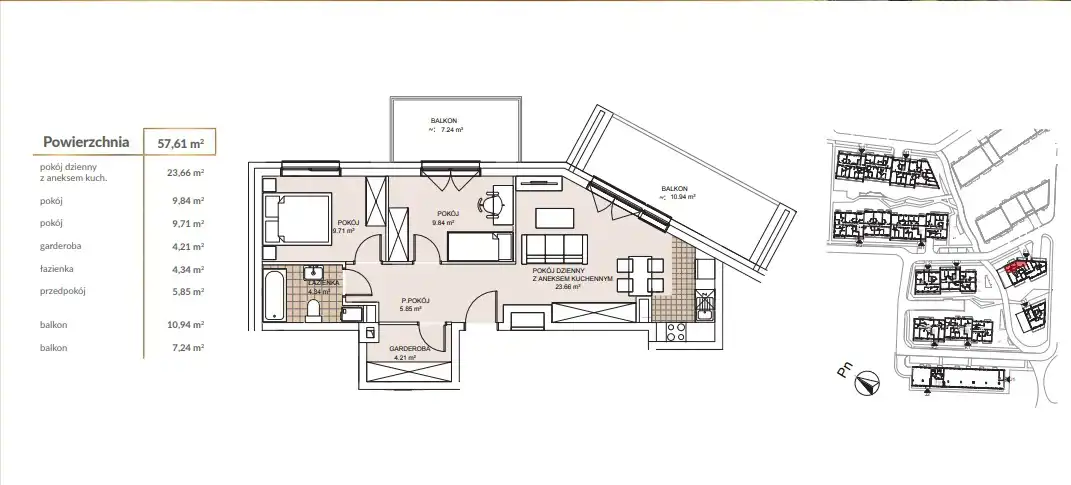 - Charakterystyka mieszkania 57.6 m2, 3 pokoje