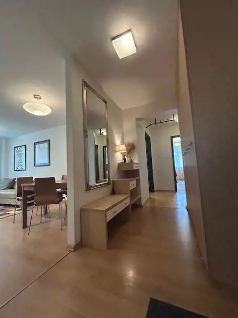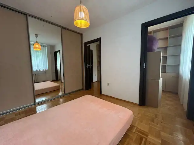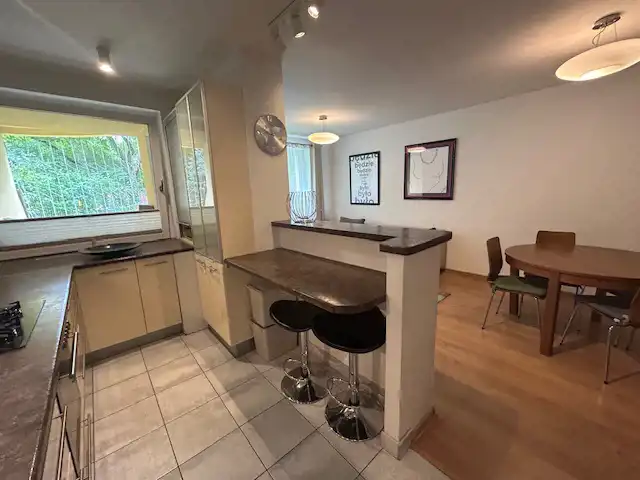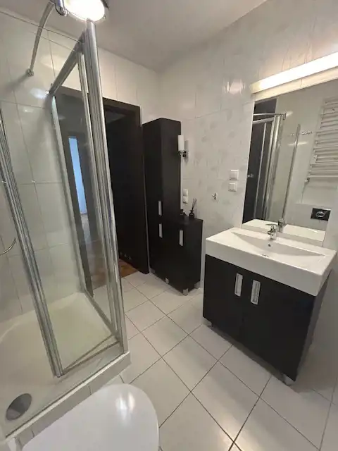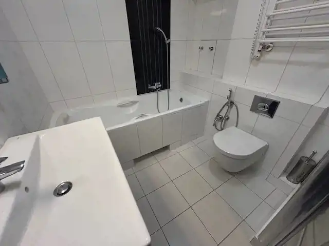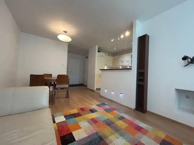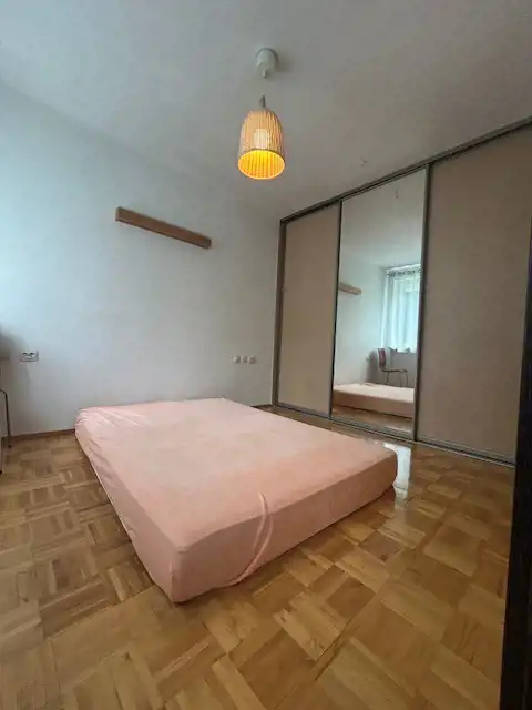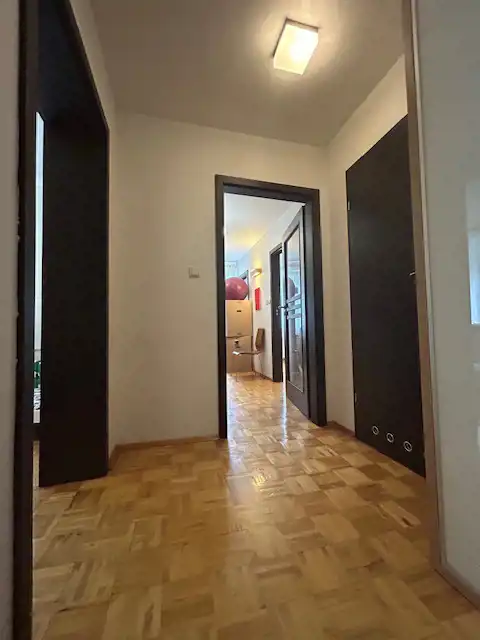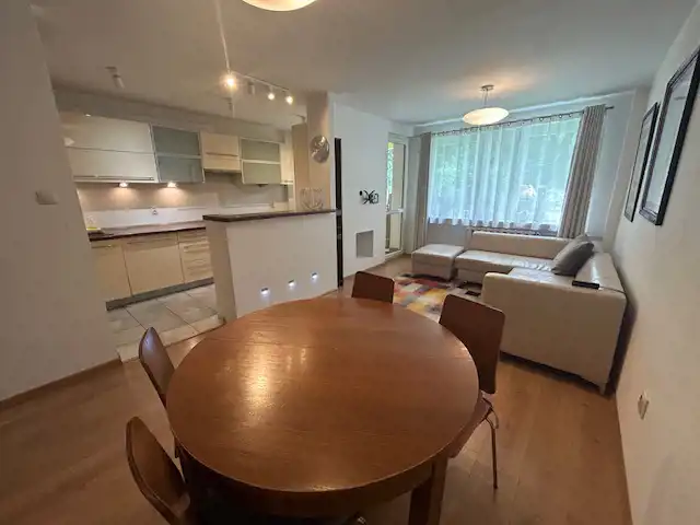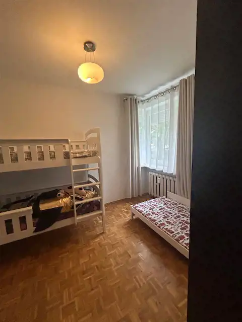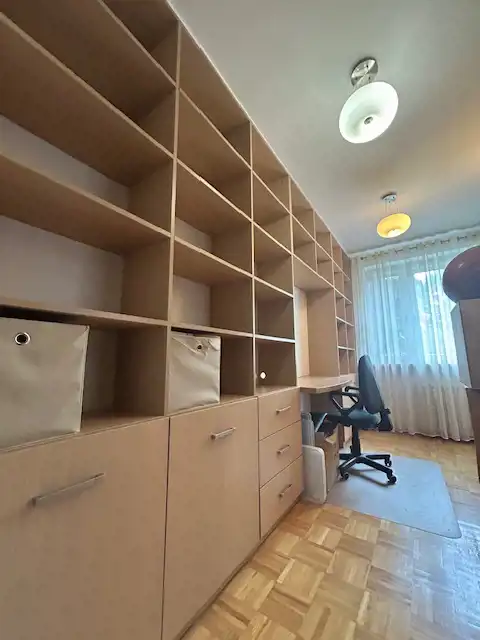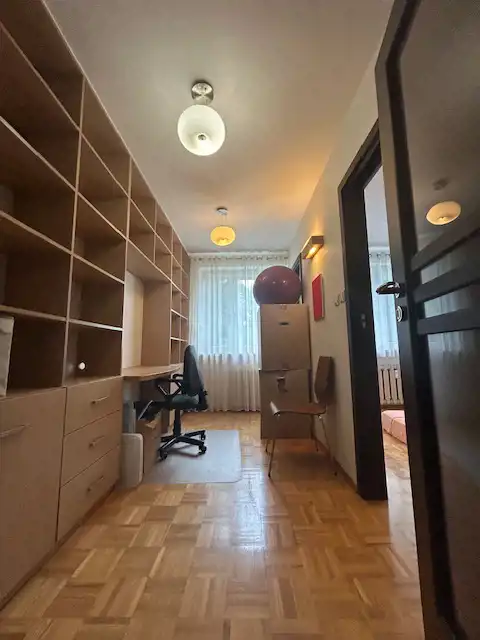 The flat is equipped with custom-made kitchen furniture with household appliances (oven, hob, hood, dishwasher, fridge) and most of the free-standing furniture visible in the photos. Bathroom with shower and bathtub, separate toilet, tiled. Panels and tiles on the floors; in the bedroom, study and small room there is a wooden floor. In the hall there is a built-in custom-made wardrobe. The apartment includes a spacious balcony with a nice view of the greenery and a large basement (about 10 sq m). Free parking spaces under the block or on the square with a barrier that belongs to the cooperative.