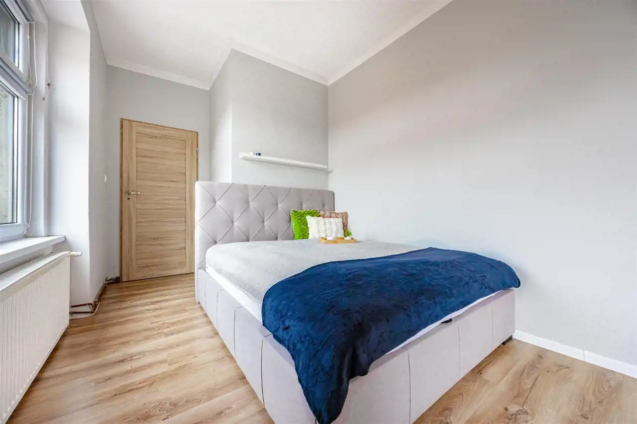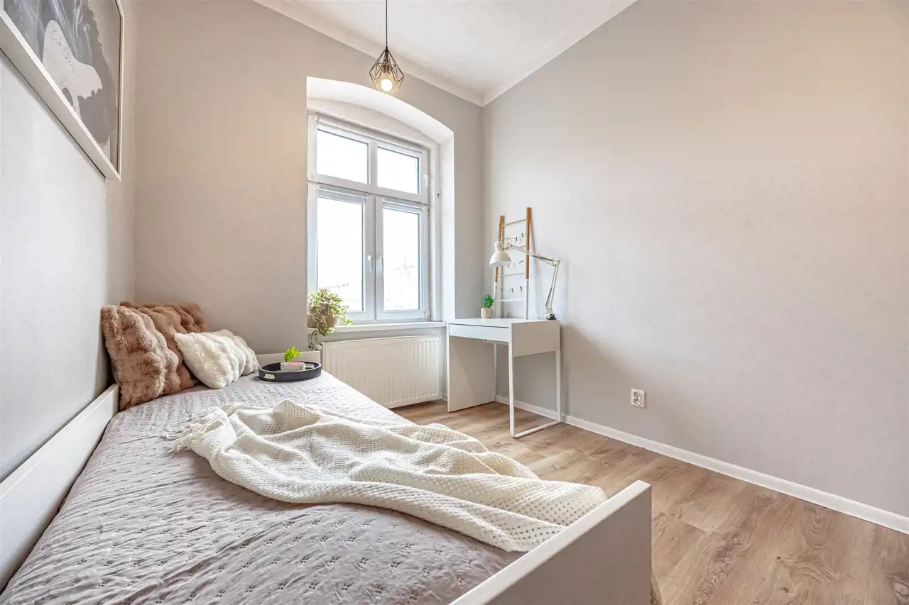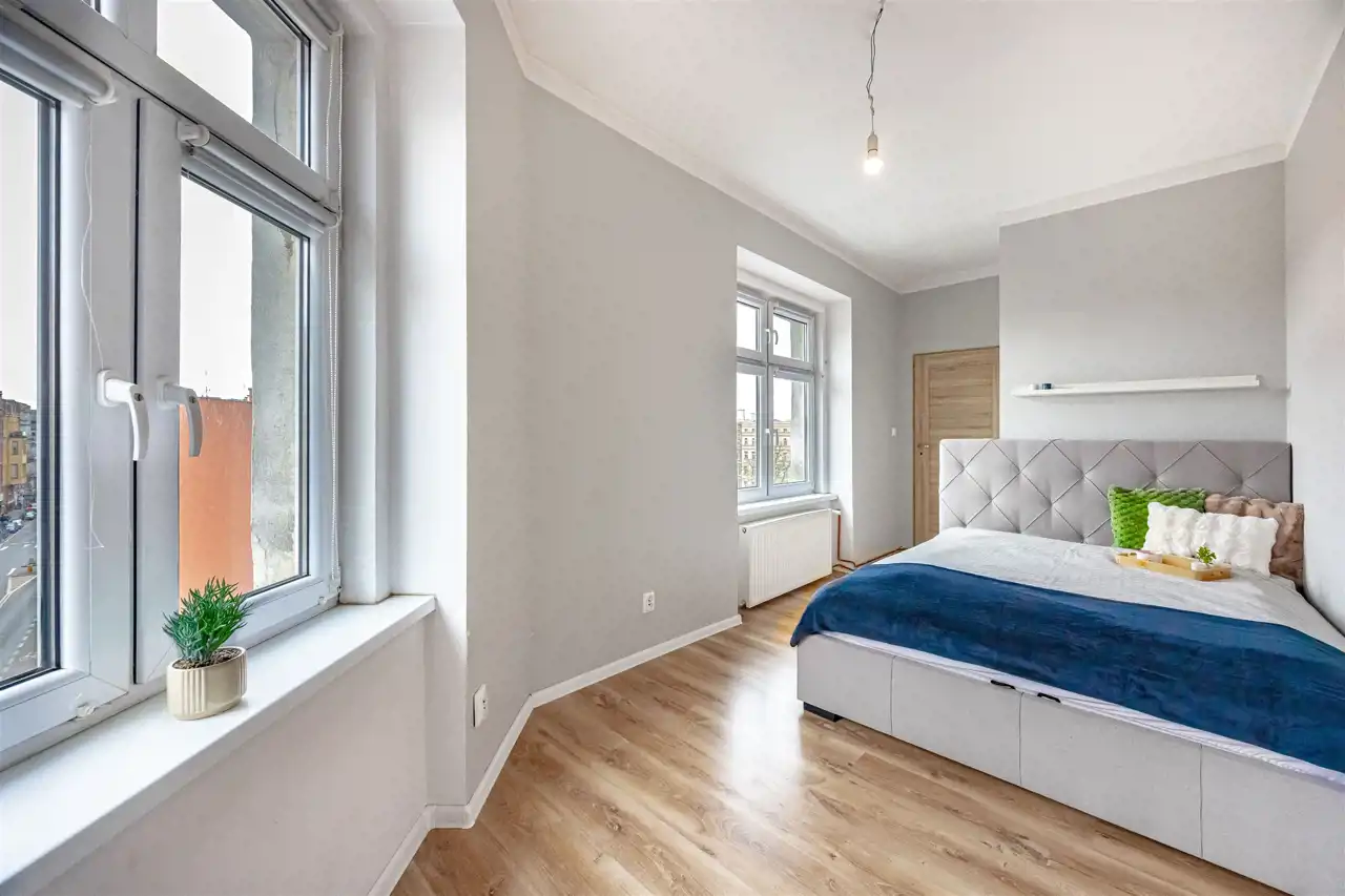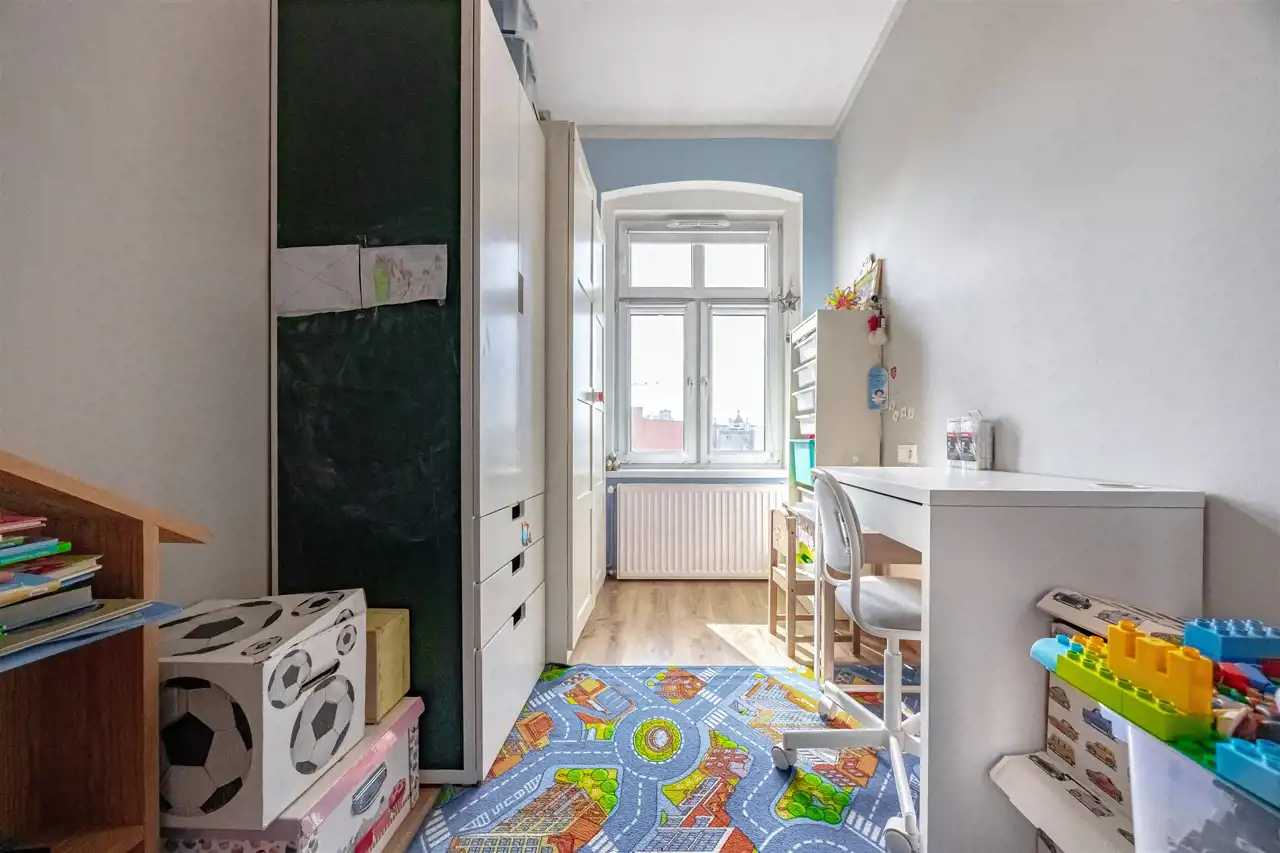 Mieszkanie o powierzchni 87,31 m2 znajduje się na czwartym piętrze kamienicy, jest dwustronne i jasne. Prężnie działająca współnota, spokojne i nowoczesne sąsiedztwo. Do mieszkania przynależy piwnica o powierzchni 9,05 m2, która jest uwzględniona w księdze wieczystej.