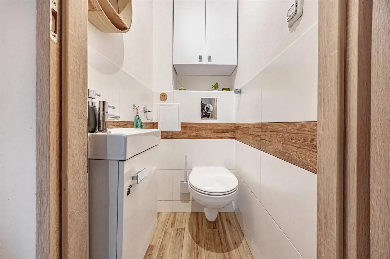 Panele winylowe w kuchni, ogrzewanie podłogowe w toalecie.