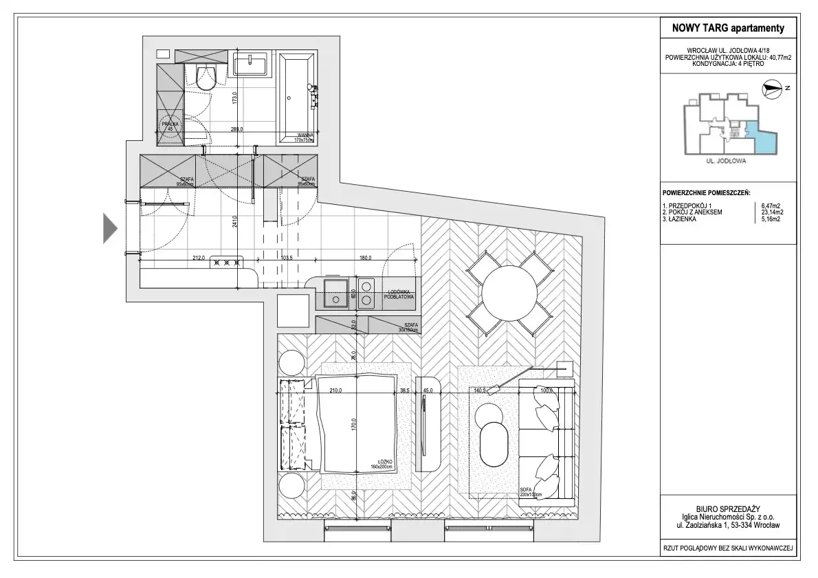 Przestrzeń, światło i styl w samym sercu Wrocławia – przy Jodłowej 4 czeka elegancki, dwupokojowy apartament o powierzchni 40,77 m², położony na 4. piętrze nowej kamienicy z 2020 roku, z windą. Lokalizacja jest wyjątkowa: tuż obok placu Nowy Targ, który w ostatnich latach zmienił się w zieloną enklawę w centrum miasta – z miejscem do odpoczynku, spotkań i codziennej rekreacji. Sama Jodłowa pozostaje uliczką cichą i kameralną, dzięki czemu można korzystać z uroków Starego Miasta bez rezygnowania ze spokoju.