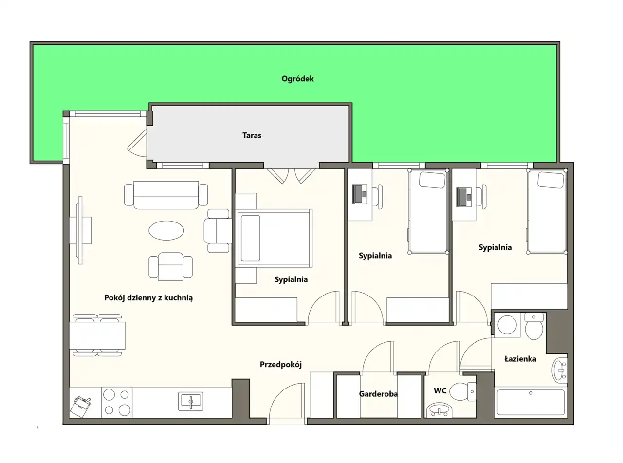- trzy ustawne sypialnie - każda ponad 10 m2