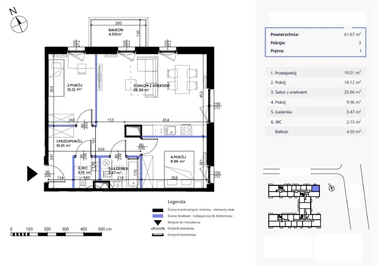 - Charakterystyka mieszkania 61.67 m2, 3 pokoje