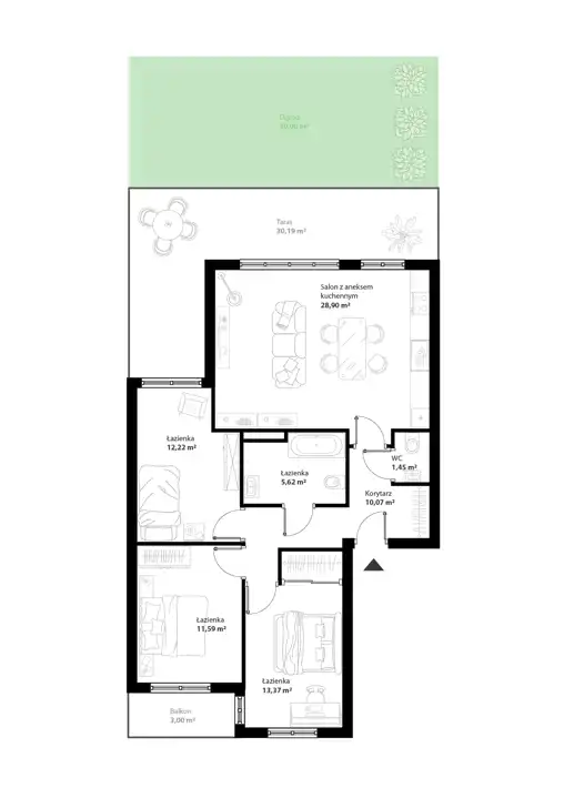 taras o powierzchni aż 29,90 m² z wyjściem na prywatny ogród o wielkości 50 m² – idealne miejsce na relaks, zabawy z dziećmi czy poranną kawę