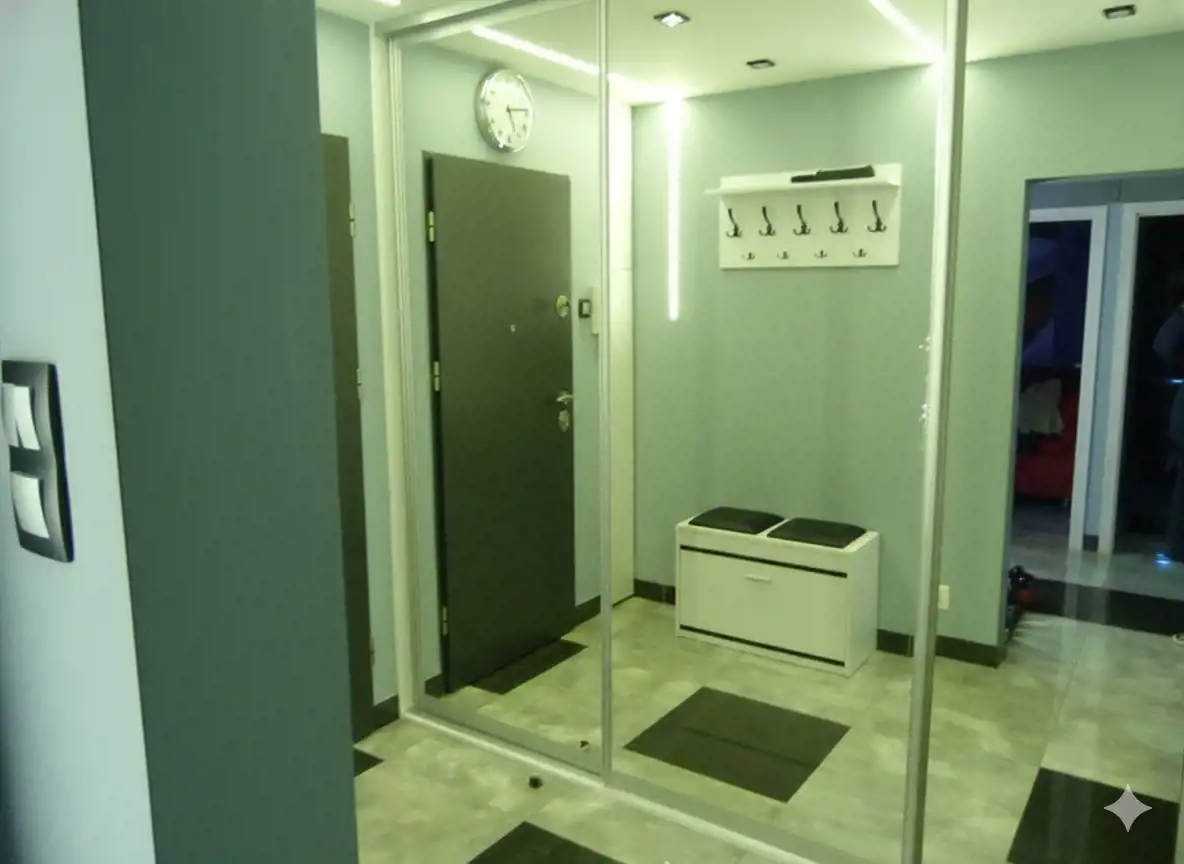 Duże Szafy: W przedpokoju i sypialniach znajdują się przestronne szafy w zabudowie (jedna z lustrzanym frontem), zapewniające optymalną przestrzeń do przechowywania.