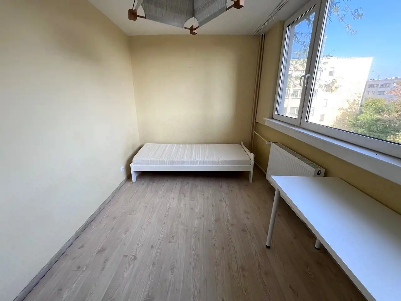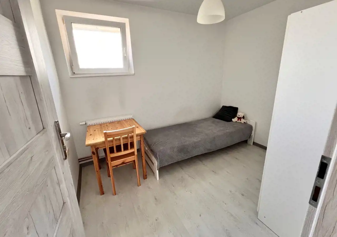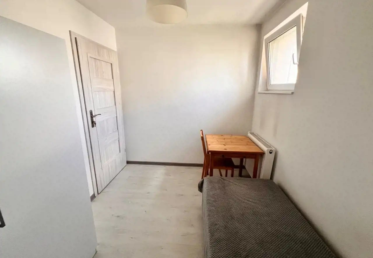 W pokoju łóżko z materacem, biurko, krzesło, szafa,