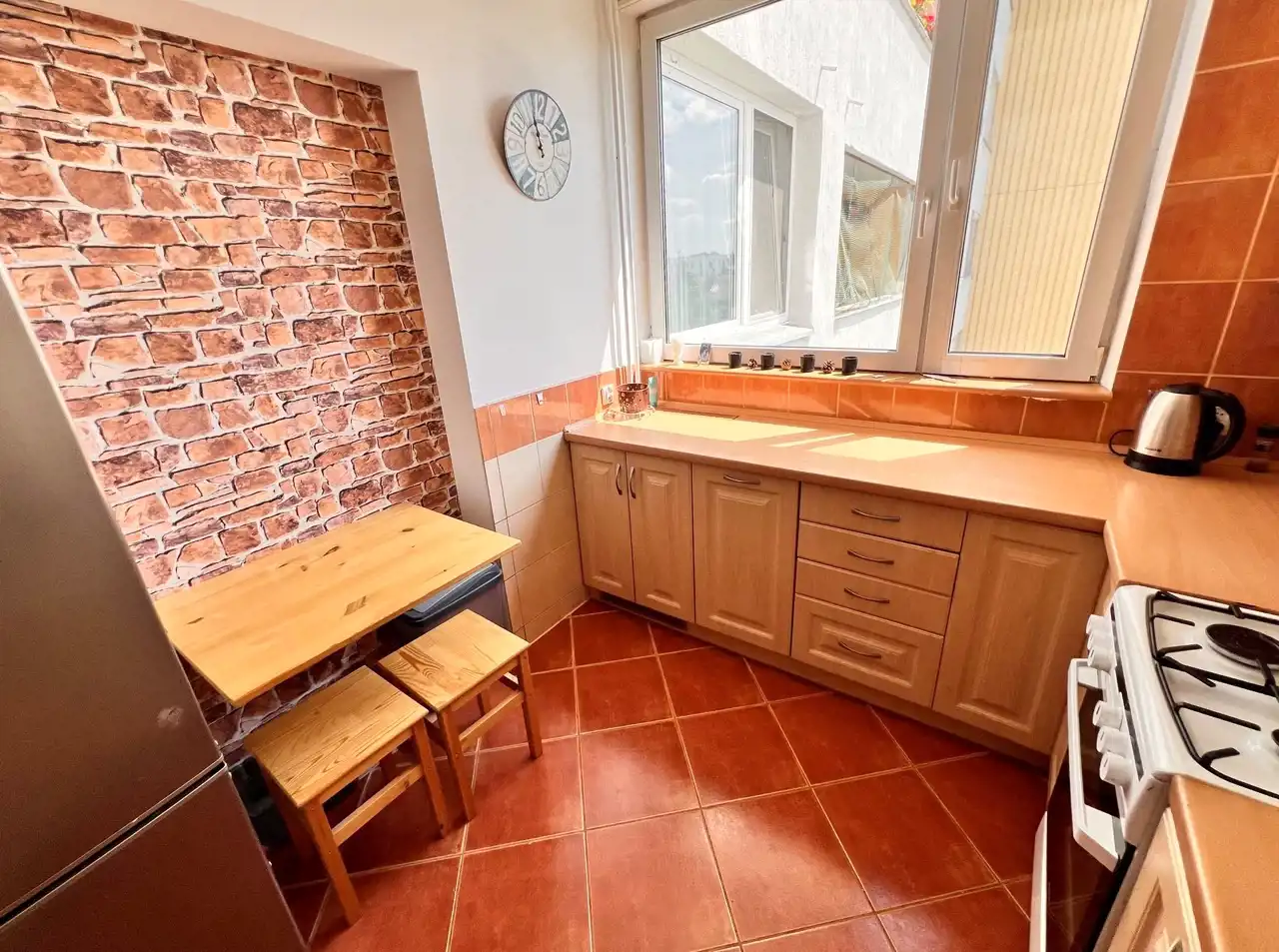 - oddzielna kuchnia z oknem - z pełnym wyposażeniem (naczynia kuchenne) oraz sprzętem AGD (dwie duże lodówki, kuchenka gazowa, piekarnik, czajnik elektryczny, zmywarka, stół z taboretami,
