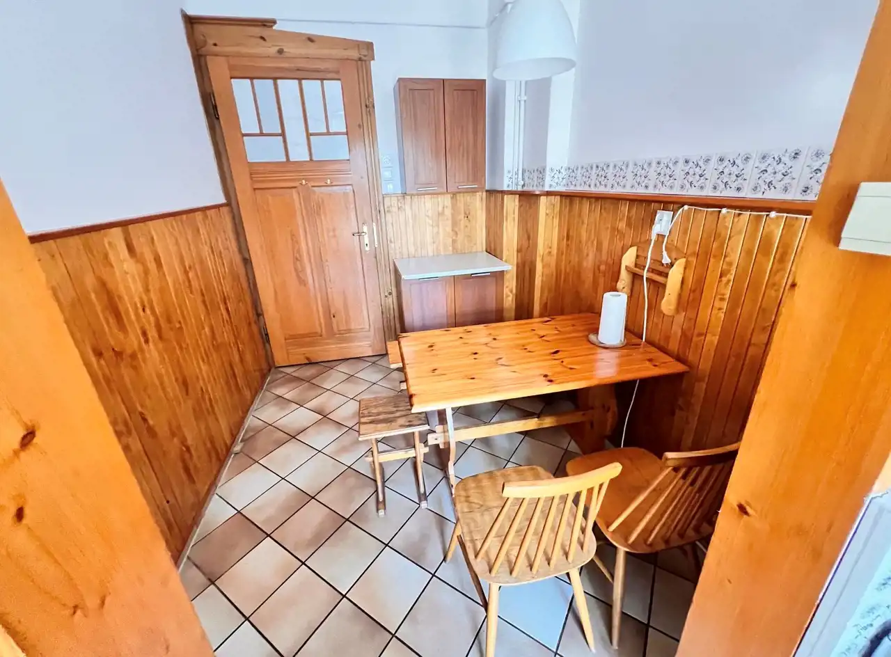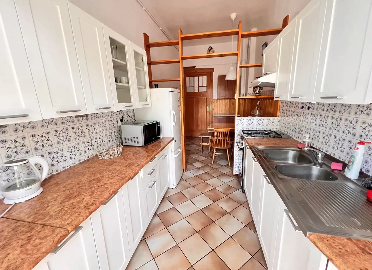 - oddzielna kuchnia z oknem - z pełnym wyposażeniem (naczynia kuchenne) oraz sprzętem AGD (lodówko-zamrażarka, kuchenka gazowa, piekarnik, czajnik elektryczny, mikrofalówka. W kuchni wydzielona jadalnia - duży stół z krzesłami,