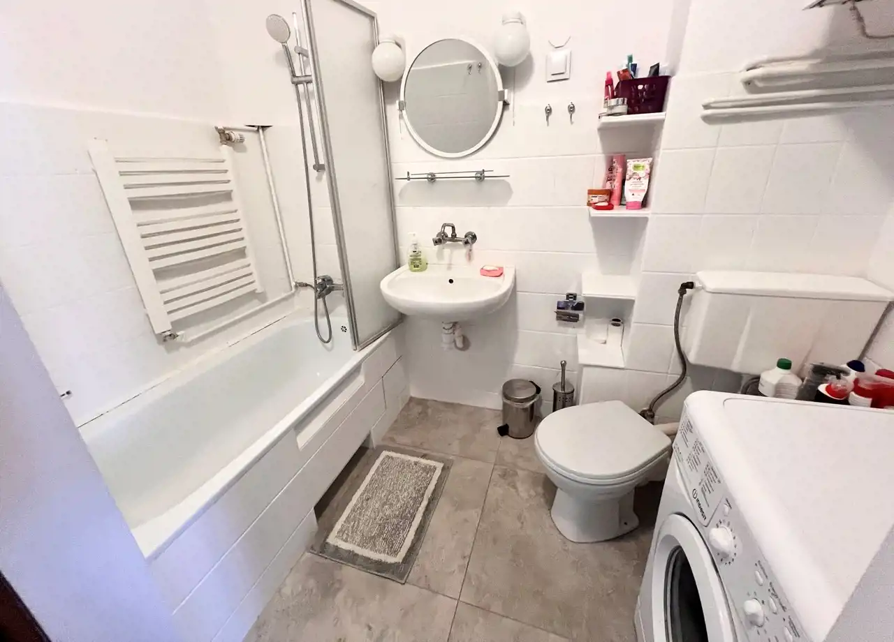 - łazienka z wanną z parawanem prysznicowym oraz WC, wyposażona w półki na kosmetyki/ przybory toaletowe oraz pralkę,