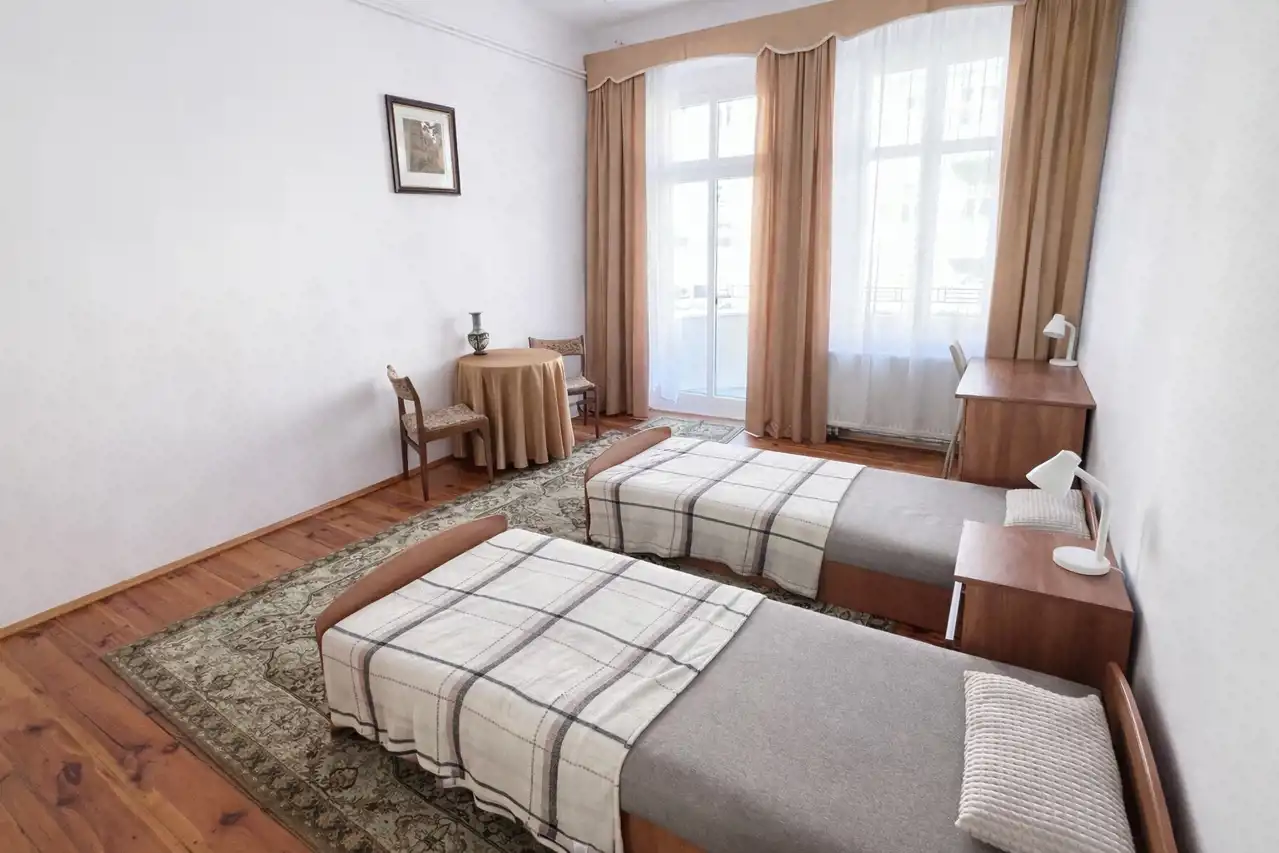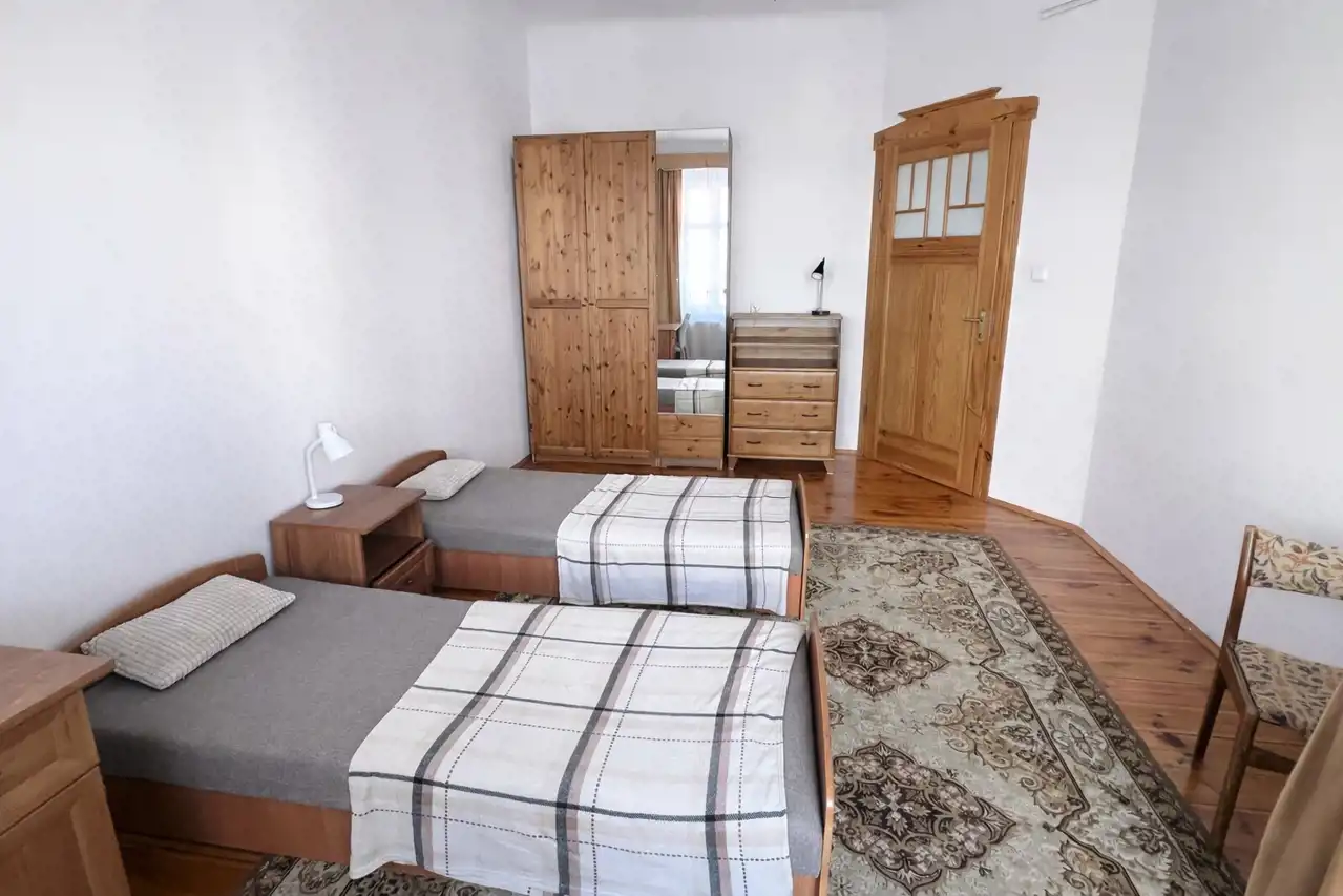 W pokoju dwa łóżka (można złączyć w jedno duże łóżko), stolik + krzesła, dwa biurka z krzesłami, szafa, komoda, regały, szafka nocna.