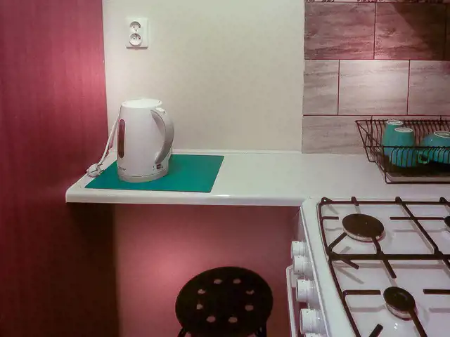 Kuchnia w pełni wyposażona w sprzęt AGD - lodówka, kuchenka gazowa, czajnik, podstawowe