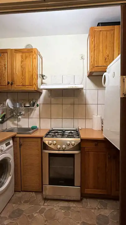 Mieszkanie wyposażone jest w podstawowe meble i sprzęty AGD, w tym lodówkę, kuchenkę gazową oraz pralkę.