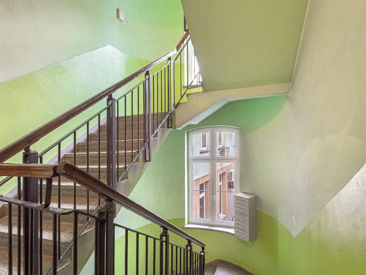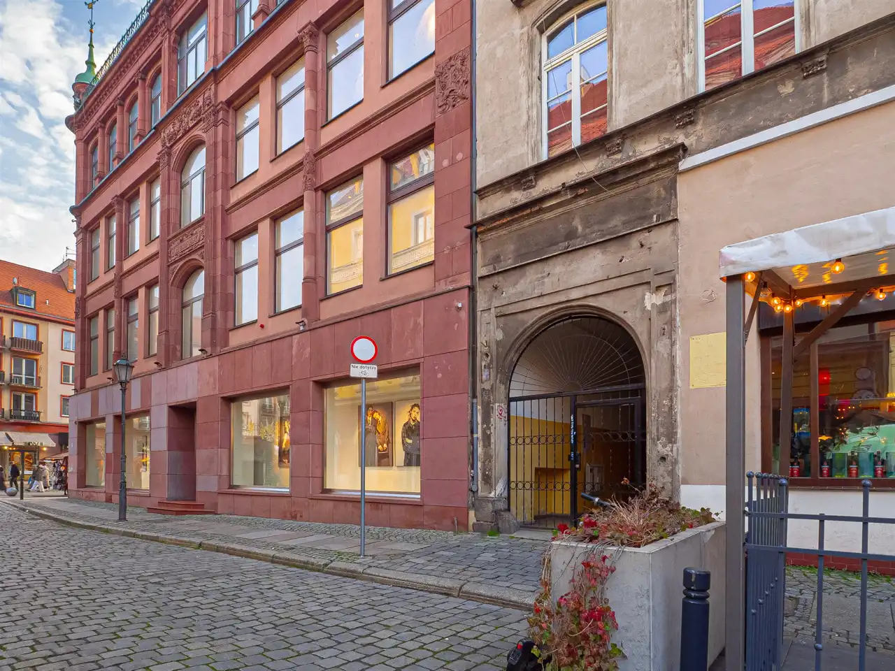 Zaletą mieszkania jest jego lokalizacja, w samym sercu Wrocławia kilka kroków od słynnego Rynku. Wejście do budynku i ekspozycja okien przy spokojnej ulicy.